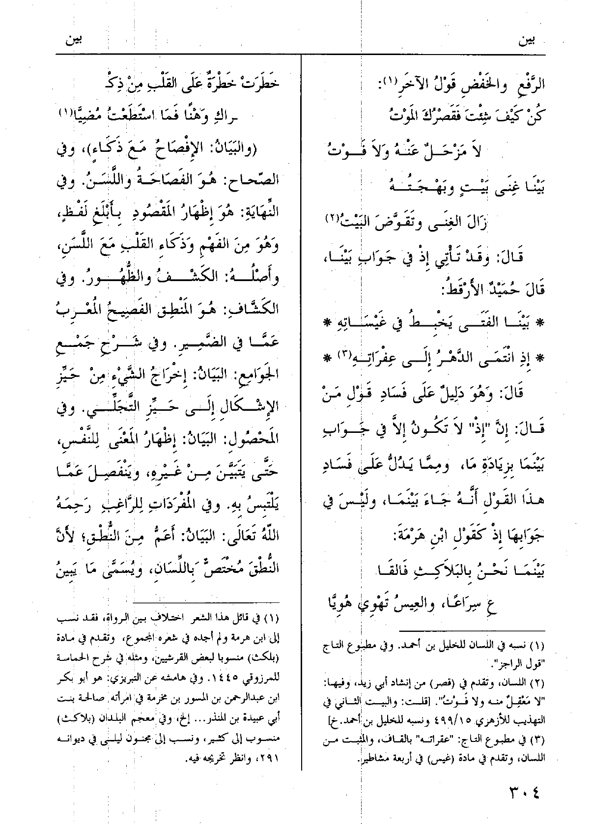 بَيْنما نحنُ بالبَلاكِثِ فالْقاعِ سِراعاً والعِيسُ تَهْوي هُوِيَّاخطَرَتْ خطْرةٌ على القلبِ مِن ذِكراكِ وَهْناً فَمَا استَطَعتُ مُضِيَّا ( {والبَيانُ: الإفْصاحُ مَعَ ذَكاءٍ) .