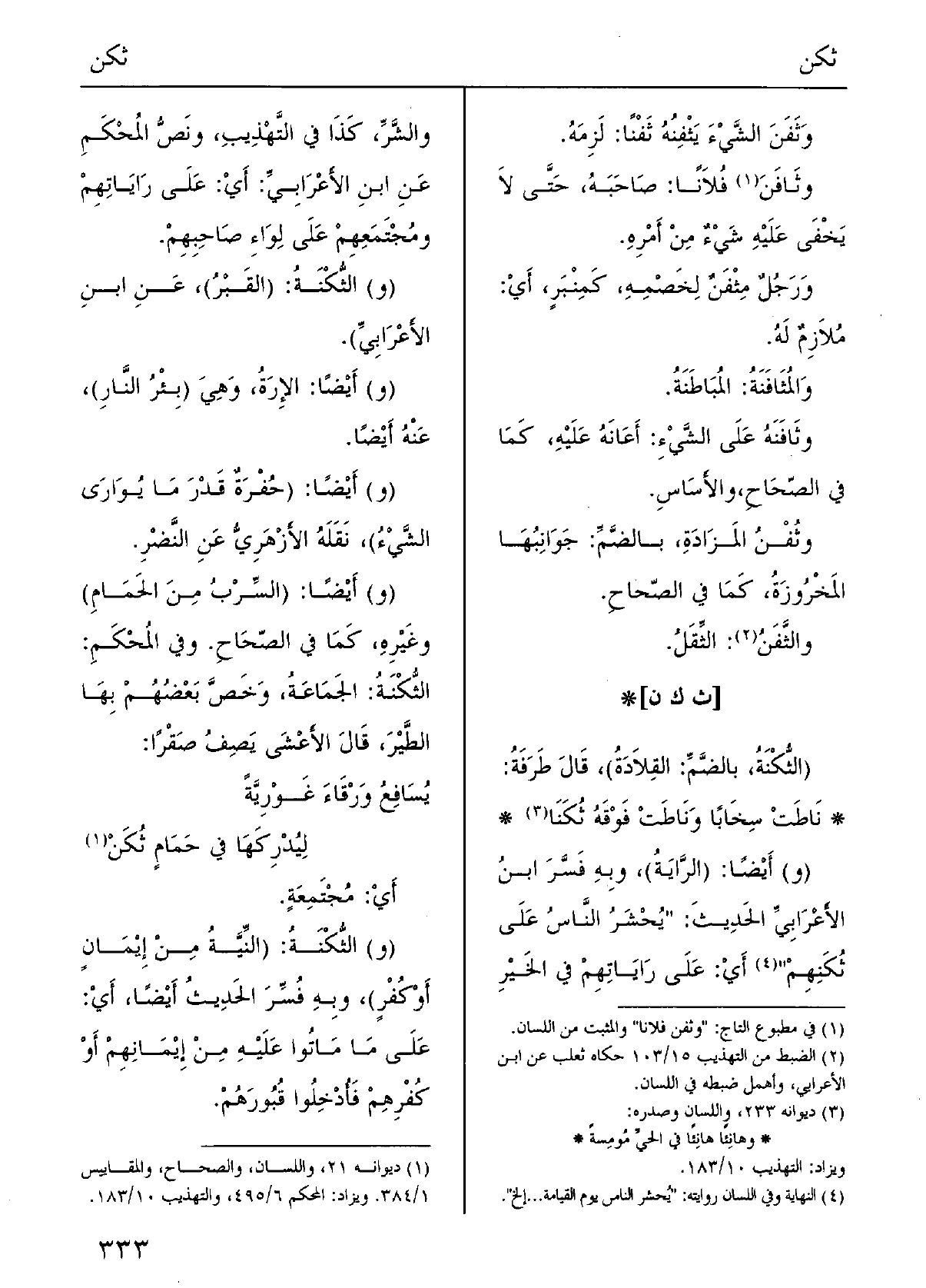 ناطَتْ سِخاباً وناطَتْ فوْقَه ثُكَنا (و) أَيْضاً: (الرَّايَةُ) ؛) وَبِه فَسَّر ابنُ الأَعْرابيِّ الحَدِيْثَ: (يُحْشَرُ الناسُ على ثُكَنِهم) ؛ أَي على رَاياتِهم فِي الخَيْرِ وَفِي الشَّرِّ؛ كَذَا فِي التَّهْذِيبِ.