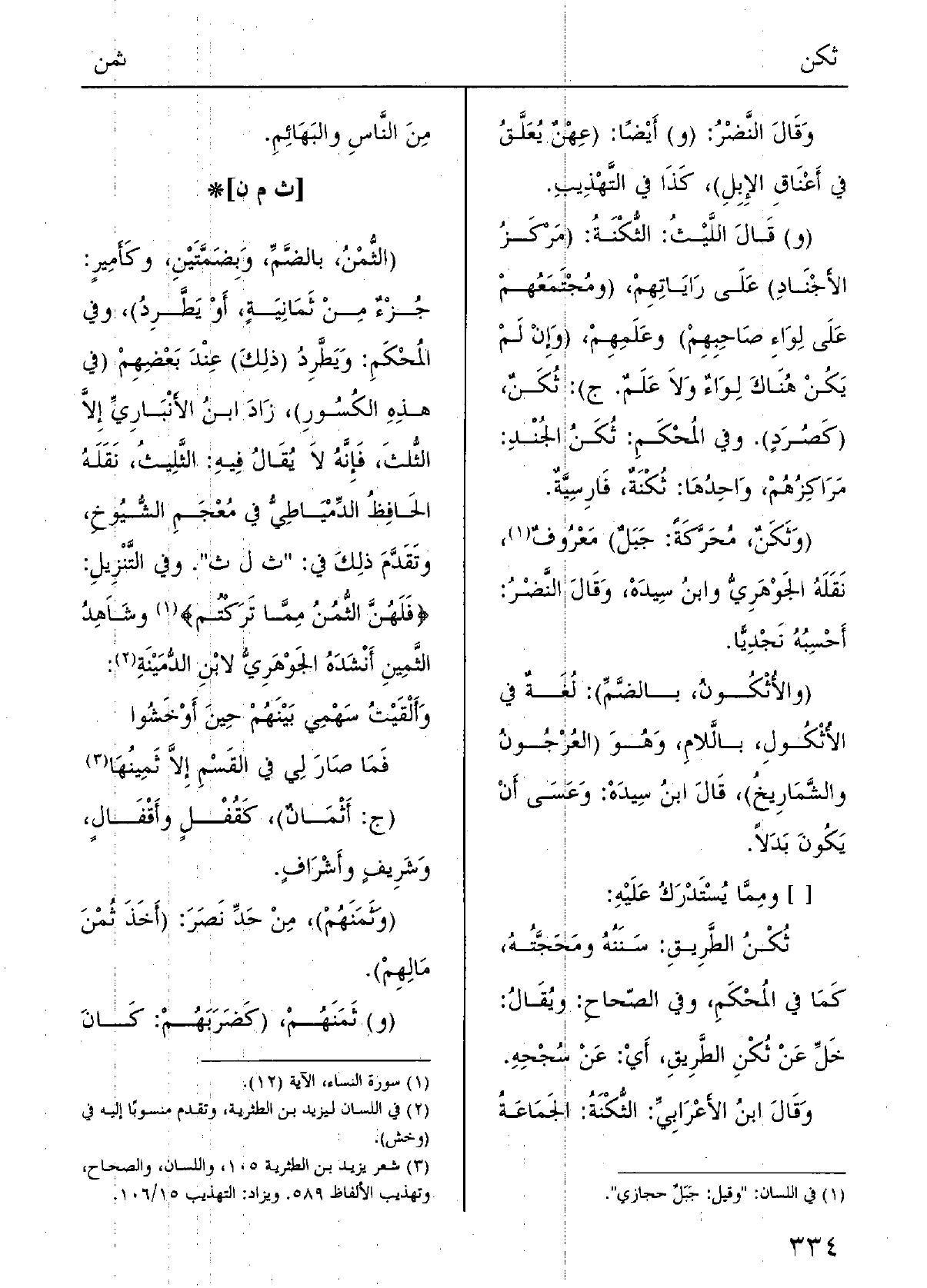 وأَلْقَيْتُ سَهْمِيَ بَيْنهم حينَ أَوْخَشُوافما صارَ لي فِي القَسْمِ إلاَّ ثَمينُها (ج أَثْمانٌ) ، كقُفْلٍ وأَقْفالٍ وشَريفٍ وأَشْرافٍ.