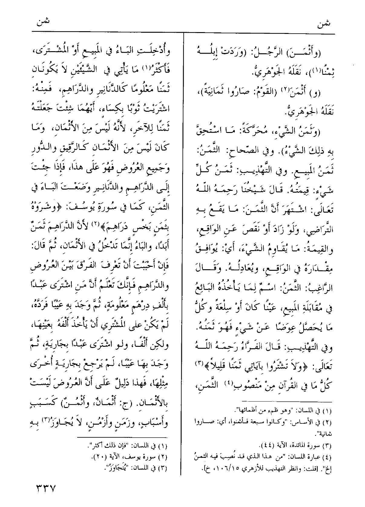 وقالَ الرَّاغِبُ: الثَّمَنُ اسْمٌ لمَا يأْخُذُه البائِعُ فِي مقابلَةِ المَبِيعِ عَيْناً كانَ أَو سلْعَةً، وكلُّ مَا يَحْصلُ عِوَضاً عَن شيءٍ فَهُوَ ثَمَنُه.