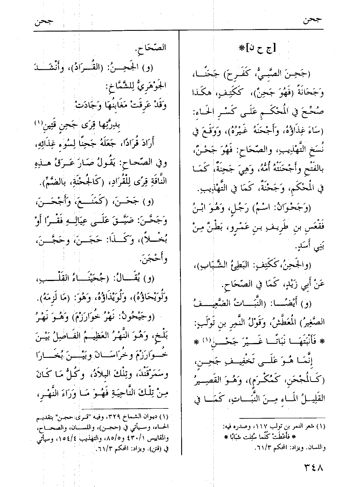 (كالمُجْحَنِ، كمُكْرَمٍ) ، وَهُوَ القَصيرُ القَلِيلُ الماءِ مِن النَّباتِ؛ كَمَا فِي الصِّحاحِ.