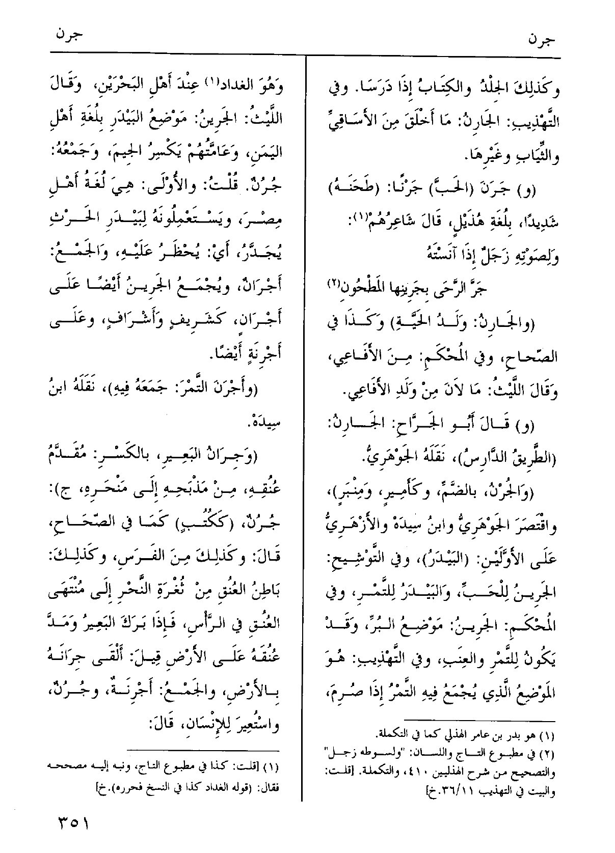 قُلْتُ: وَالْأولَى هِيَ لُغَةُ أَهْلِ مِصْرَ، ويَسْتَعْملونَه لبَيْدَرِ الحَرْثِ يُجْدَّر أَي يُحْظَر عَلَيْهِ، والجَمْعُ أَجْرانٌ، ويُجْمَعُ الجَرِينُ أَيْضاً على أَجْرانٍ كشَرِيفٍ وأَشْرافٍ، وعَلى أَجْرنَةٍ أَيْضاً.