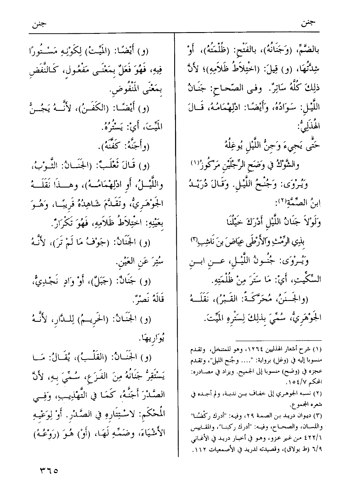 وَفِي الصِّحاحِ: جَنانُ اللَّيْلِ: سَوادُهُ، وأَيْضاً: ادْلِهْمامُه؛ قالَ الهُذَليُّ: