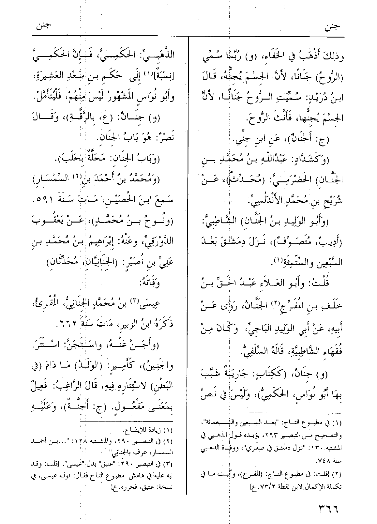 (و) {جِنانُ، (ككِتابٍ: جاريَةٌ شَبَّبَ بهَا أَبو نُوَاسٍ الحَكَمِيُّ) ، وليسَ فِي نصّ الذهبيِّ الحَكَمِيّ؛ فإنَّ الحَكَمِيّ إِلَى حَكَم بنِ سَعْدِ العَشِيرَةِ، وأَبو نُوَاسٍ المَشْهورُ ليسَ مِنْهُم، فليتأَمَّل.