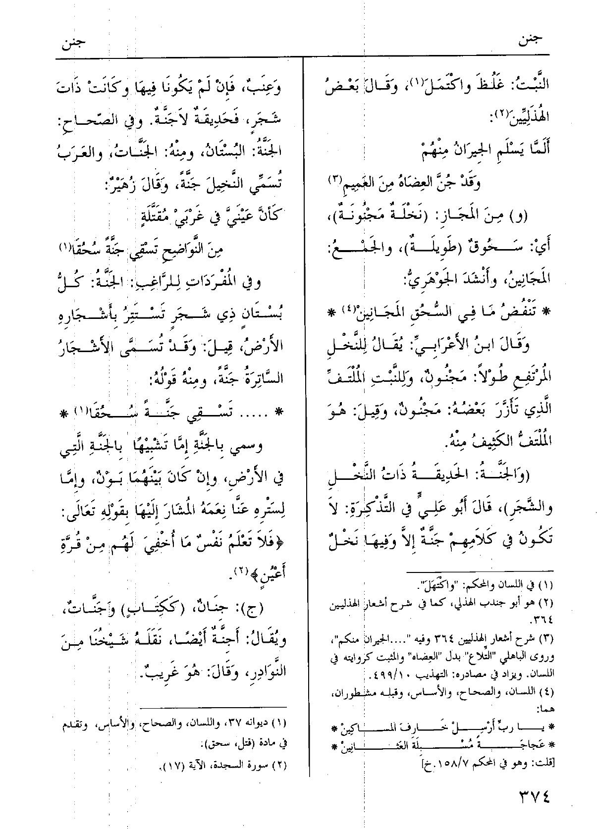 كأَنَّ عينيَّ فِي غَرْبَيْ مُقَتَّلةٍ مِن النَّواضِح تَسْقي جَنَّةً سُحُقا وَفِي المُفْردات للرَّاغبِ: الجَنَّةُ كُلُّ بُسْتانٍ ذِي شَجَرٍ تَسْتَتِرُ بأَشْجارِه الأَرضُ، قيلَ: وَقد تُسمَّى الأَشْجارُ الساتِرَةُ جَنَّة، وَمِنْه قَوْلُه: