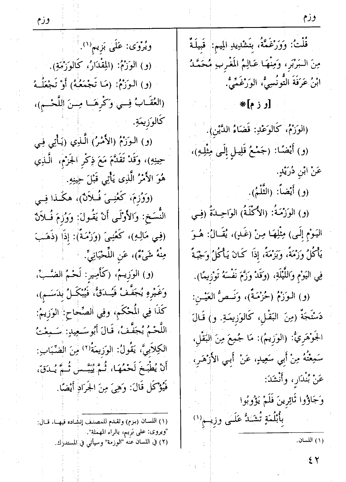 ويُروى: على بَزيمِ. (و) {الوَزْمُ: (المقدارُ،} كالوَزْمَةِ) . (و) الوَزْمُ: (مَا تجْمَعُهُ) أَو تَجْعَلهُ (العُقابُ فِي وَكْرِها من اللَّحْم) ، {كالوَزيمة. (و) الوَزْمُ (الْأَمر) الَّذِي (يَأْتِي فِي حِينه) ، وَقد تقدَّم مَعَ ذكر الْجَزْم، الَّذِي هُوَ الْأَمر الَّذِي يَأْتِي قبل حِينه. (} ووُزِمَ، كَعُنِىَ فُلانٌ) ، هَكَذَا فِي النُّسخ: وَالْأولَى أَن يَقُول: وَوُزِمَ فلانٌ (فِي مَاله) ، كَعُنِىَ ( {وَزْمَةً) إِذا (ذهب مِنْهُ شَيْء) ، عَن اللِّحياني. (و) } الوَزيمُ، (كأمير: لحمُ الضَّبِّ، وَغَيره يجفَّف فيُدقُّ، فيُبْكَلُ بدَسَمٍ) ، كَذَا فِي المُحكم، وَفِي الصِّحاح: الوَزيمُ: اللَّحْم يجفَّفُ، قَالَ أَبُو سعيد: سَمِعت الكِلابي، يَقُول:! الوَزيمَةُ من الضِّباب: أَن يُطبخ لحمُها، ثمَّ يُيَبَّس ثمَّ يُدقّ، فيؤكل قَالَ: وَهِي من الْجَرَاد أَيْضا.