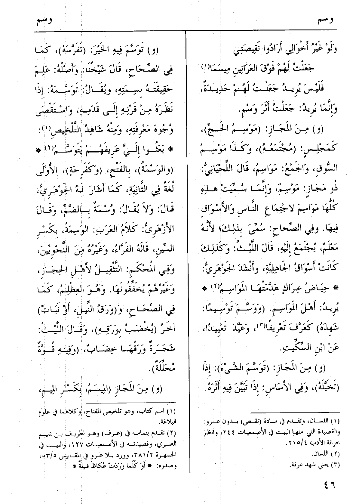 يُرِيد: أهل المواسِمِ. (} وَوَسَّمَ {تَوْسيمًا: شَهِدَهُ) كعَرَّفَ تعريفًا، وعيَّدَ تَعْيِيدًا، عَن ابْن السَّكيت. (و) من الْمجَاز: (} تَوَسَّمَ الشيءَ) : إِذا (تَخَيَّلَهُ) ، وَفِي الأساس: إِذا تَبَيَّنَ فِيهِ أثرَهُ. (و) توسَّم فِيهِ الخيْرَ: (تَفَرَّسَهُ) ، كَمَا فِي الصِّحاح، قَالَ شَيخنَا: وَأَصله: عَلِمَ حقيقَتَهُ {بسِمَتِهِ، وَيُقَال:} تَوَسَّمَهُ: إِذا نظرَهُ من قرْنِه إِلَى قدمِهِ، واسْتَقْصى وُجُوه معرفَتِهِ، وَمِنْه شَاهد التَّلخيص: