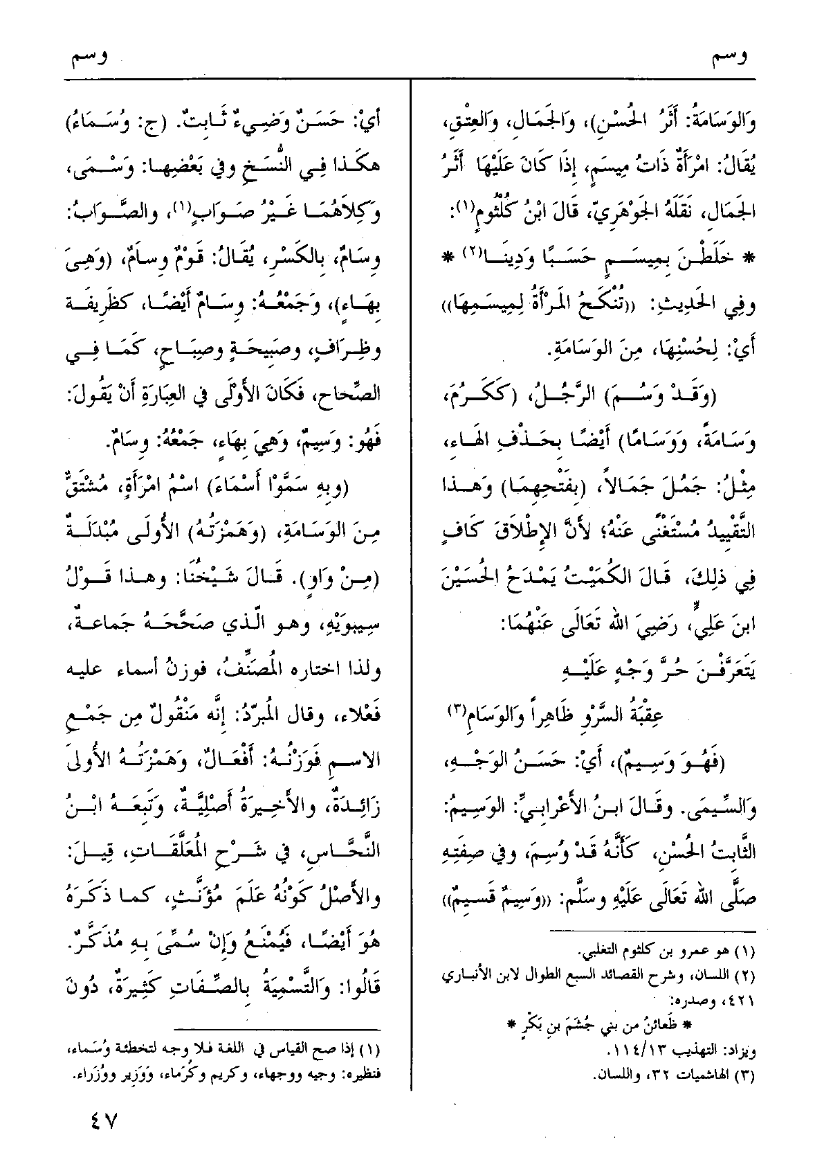 (فَهُوَ} وَسِيمٌ) ، أَيْ: حَسَنُ الوَجْهِ، {وَالسِّيمَى. وقَالَ ابنُ الأَعْرابِيٍّ:} الوَسِيم: الثَّابِتُ الحُسْنِ، كَأَنَّهُ قَدْ {وُسِمَ، وَفِي صِفَتِهِ صَلَى الله تَعَالَى عَلَيْهِ وسَلَّم: ((} وَسِيمٌ قَسيِمٌ)) أيْ: حَسَنٌ وَضِيءٌ ثَابِتٌ. (ج: {وُسَمَاءُ) هكَذا فِي النُّسَخِ وَفِي بَعْضِها:} وَسْمَى، وَكِلاَهُمَا غَيْرُ صَوَابٍ، والصَّوَابُ: وِسَامٌ، بِالكَسْرِ، يُقَالُ: قَوْمٌ {وِسامٌ، (وَهِىَ بِهَاءٍ) ، وَجَمْعُهُ: وِسَامٌ أَيْضاً، كظَرِيفَة وظِرَافٍ، وصبَيجةٍ وصِبَاح، كَمَا فِي الصِّحاح، فَكَانَ الأَوْلَى فِي العِبَارة أَنْ يَقُولَ: فَهُو: وَسِيمٌ، وَهِيَ بِهَاءٍ، جَمْعُهُ: وِسَامٌ. (وبِهِ سَمَّوْا} أَسْماء) اسْمُ امْرَأَةٍ، مُشْتقٌّ مِنَ! الوَسَامِةِ، (وَهَمْزَتُهُ) الأُولَى مُبْدَلَةٌ (مِنْ وَاوٍ) ، قَالَ شِيْخُنَا: وَهَذَا قَوْلُ سِيبوَيْهِ، وَهُوَ الّذي صَحَّحُهُ جَماعُة، وَلذَا اخْتَارَهُ المُصَنِّف، فوزنُ أَسمَاء عَلَيْهِ فَعْلاء، وَقَالَ المُبّردُ: إِنَّه مَنْقُولٌ مِن جَمْعِ الِاسْم فَوَزْنُهُ: أَفْعَالٌ، وَهَمْزَتُه الأُولَى زَائِدَةٌ، والأَخِيرَةُ أَصْلِيَّةُ، وَتَبَعهُ ابْنُ النَّحَّاسِ، فِي شَرْحِ المُعَلَّقَاتِ، قِيلَ: والأَصْلُ كَوْنُهُ عَلَمَ مُؤَنَّثٍ، كَمَا ذَكَرَهُ هَوَ أَيْضاً، فَيُمْنَعُ وَإِنْ سُمِّى بِهِ مُذَكَّرٌ. قَالُوا: وَالتَّسْمِيَةُ بِالصِّفَاتِ كَثِيرَةٌ، دُونَ