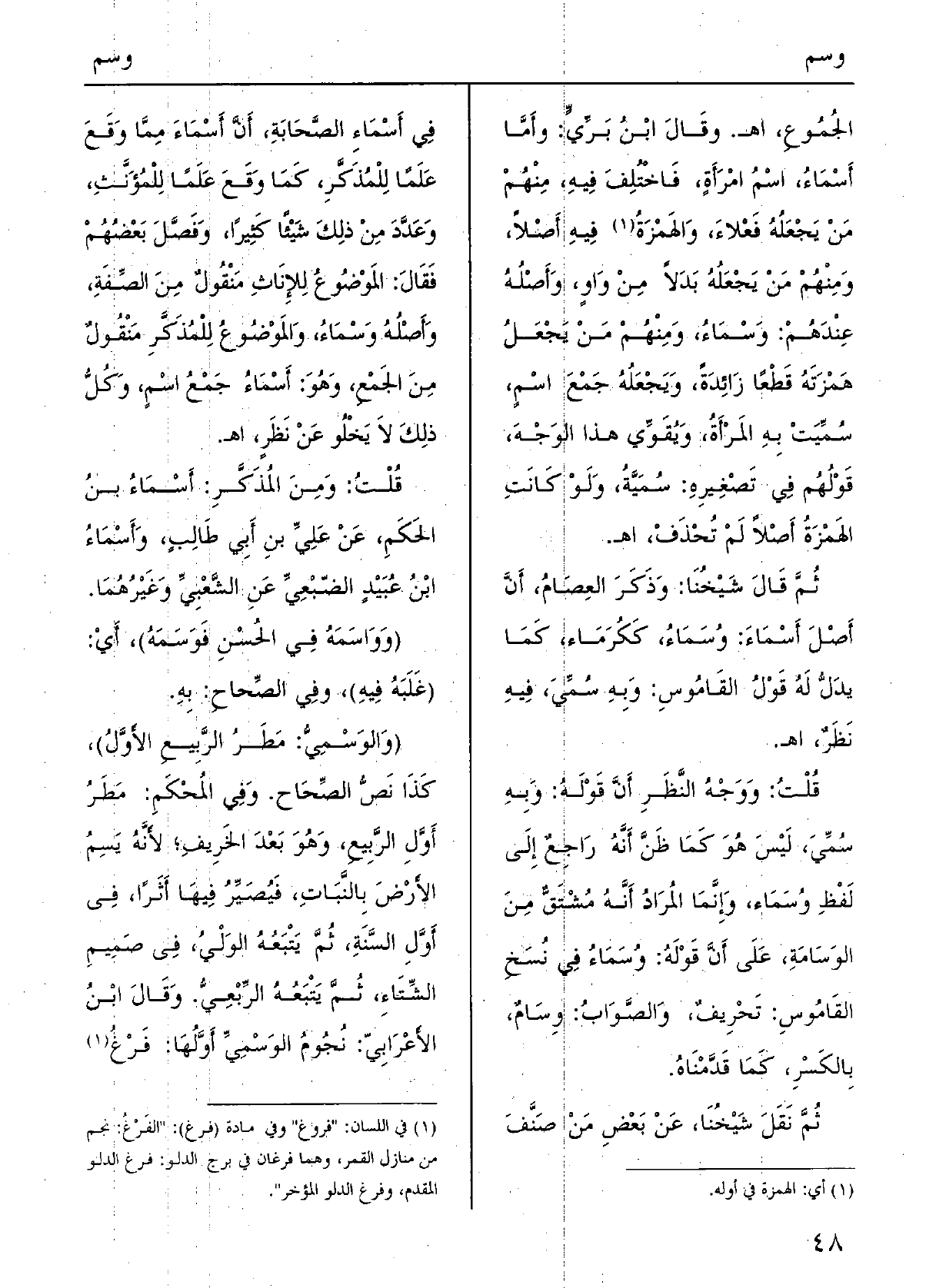 الجُموعِ، اه. وَقَالَ ابْن بَرِّي: وَأما أسماءُ، اسْم امرأةٍ، فاخْتُلِف فِيهِ، مِنْهُم من يجعلُهُ فَعْلاء، والهَمزةُ فِيهِ أصلا، وَمِنْهُم من يَجعله بَدَلا من وَاو، وأصلُهُ عِنْدهم: {وَسْمَاءُ، وَمِنْهُم من يَجْعَل هَمْزَتَهُ قطعا زَائِدَة، ويجعله جمع اسْم، سُمَّيَت بِهِ الْمَرْأَة، ويُقَوِّي هَذَا الْوَجْه، قولُهُم فِي تصغيره: سُمَيَّةُ، وَلَو كَانَت الْهمزَة أصلا لم تُحذف، اه. ثمَّ قَالَ شَيخنَا: وَذكر العِصام، أنَّ أصل أسماءَ:} وُسماءُ، ككُرَماء، كَمَا يدل لَهُ قَول الْقَامُوس: وَبِه سُمِّيَ فِيهِ نظر، اه. قلت: وَوجه النّظر أَن قَوْله: وَبِه سُمِّيَ، لَيْسَ هُوَ كَمَا ظن أنَّه راجعٌ إِلَى لفظِ وُسَماء، وَإِنَّمَا المُرَاد أنَّه مُشْتَقٌّ من الوَسامَة، على أَن قَوْله: وُسَمَاءُ فِي نُسخ الْقَامُوس: تحريفٌ، وَالصَّوَاب: {وِسَامٌ، بِالْكَسْرِ، كَمَا قدمْنَاهُ. ثمَّ نقل شيخُنا، عَن بعض من صَنَّف فِي أَسمَاء الصَّحَابَة، أَن أسْمَاءَ مِمَّا وَقع عَلَمًا للمُذَكَّر، كَمَا وَقع عَلَمًا للمُؤَنَّث، وعدَّد من ذَلِك شَيْئا كثيرا، وفصَّل بَعضهم فَقَالَ: الْمَوْضُوع للإناث مَنْقُول من الصَّفَةِ، وأصلُهُ وَسْمَاءُ، والموضوع للمذكر منقولٌ من الجَمعِ، وَهُوَ: أسْماءُ جمعُ اسْمٍ، وكلُّ ذَلِك لَا يَخْلُو عَن نظر، اه. قلت: وَمن المُذكَّر: أسْماءُ بن الحَكم، عَن عَليّ بن أبي طالبٍ، وأَسْمَاءُ ابْن عُبيدٍ الضّبْعِيِّ عَن الشَّعبي وَغَيرهمَا. (} وواسَمَهُ فِي الحُسْنِ {فَوَسَمَهُ) ، أَي: (غَلَبَهُ فِيهِ) ، وَفِي الصِّحَاح: بِهِ. (} والوَسْمِيُّ: مطرُ الرّبيع الأول) ، كَذَا نَص الصِّحاح. وَفِي المُحكم: مطرُ أوَّل الرّبيع، وَهُوَ بعد الخريف؛ لِأَنَّهُ يَسِمُ الأَرْض بالنبات، فَيصير فِيهَا أثرا، فِي أول السَّنَةِ، ثمَّ يَتْبَعُهُ الوَلْيُ، فِي صميمِ الشِّتاء، ثمَّ يَتْبَعُهُ الرِّبعي. وَقَالَ ابْن الْأَعرَابِي: نجومُ! الوسْمِي أوَّلُها: فرغُ