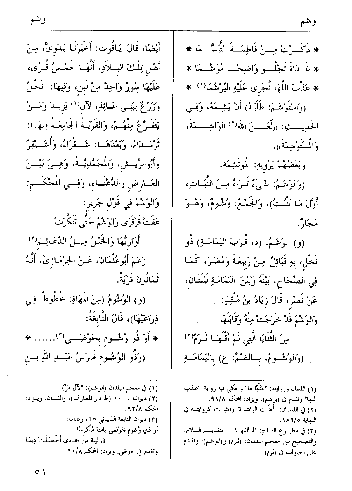 ذَكَرْتُ مِنْ فَاطِمَةَ التَّبَسَّمَا غَدَاةَ تجْلُو وَاضِحاً {مُوَشَّماَ عَذْبَ اللَّها تُجْرِى عَلِيْهِ البُرْشُمَا (} وَاسْتَوْشَمَ: طَلَبَهُ) أَنْ {يَشِمَهُ، وَفِي الحَدِيثِ: ((لَعَن الله الوَاشِمَةَ،} وَالمُسْتَوْشِمَةَ)) . وبَعضُهُم يَرْوِيهِ: {المُوتَشِمَةَ. (} وَالوَشْمُ: شَيءٌ تَرَاهَ مِنَ النَّباتِ، أَوَّلَ مَا يَنْبُتُ) ، وَالجَمْعُ: {وَشُومٌ، وَهُوَ مَجَازٌ. (و) الوَشْمٌ: (د، قُرْبَ اليَمَامَةِ) ذُو نَخْلٍ، بِهِ قَبَائِلُ مِنْ رَبِيَعَةَ وَمُضَرَ، كَمَا فِي الصِّحَاحِ، بَيْنَهُ وَبَيْنَ اليَمَامَةِ لَيْلَتَانِ، عَنْ نَصْرٍ، قَالَ زَيَادُ بنُ مُنْقَذٍ: وَالوَشْم قَدْ خَرَجَتْ مِنْهُ وَقَابَلَهَا مِنَ الثَّنَاياَ التَّيِ لَمْ أَقْلُهَا ثَرَمُ (} وَالوُشُومُ، بِالضَّمِّ: ع) بِاليَمَامَةِ أَيضْاً، قَالَ يَاقُوت: أَخْبَرَنَا بَدَوِىٌّ، مِنْ أَهْلِ تِلْكَ البِلاَدِ، أَنَّها خِمْسُ قُرًى، عَلَيْهَا سُورٌ وَاحِدٌ مِنْ لَبِنٍ، وَفِيهَا: نَخْلٌ وَزَرْعٌ لِبنَىِ عَائِذٍ، لآل يَزِيدَ وَمَنْ يَتَفَرَّعُ مِنْهُمْ، وَالقَرْيَةُ الجَامِعَةُ فِيهَا: ثَرْمَداءُ، وَبَعْدَهَا: شَقْرَاءُ، وَأُشَيْقِرُ وأَبُو الرِّيشِ، وِالمُحَمَّدِيَّةُ، وَهِيَ بَيْنَ العَارِضِ والدَّهْنَاءِ، وَفِي المُحْكَمِ: وَالوَشْمُ فِي قَوْل جَرير:
