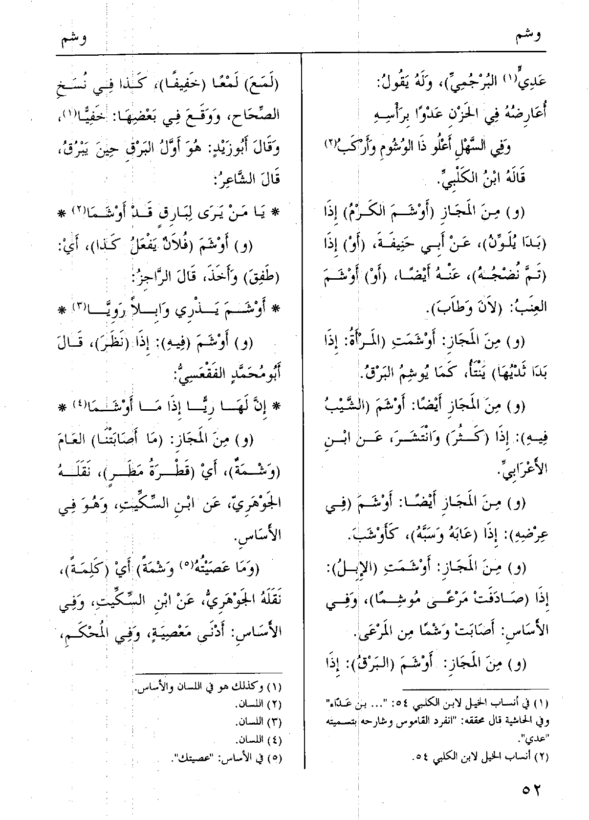 قَالَه ابْن الْكَلْبِيّ. (و) من الْمجَاز ( {أوْشَمَ الكَرْمُ) إِذا (بدا يُلَوِّنُ) ، عَن أبي حنيفَة، (أَو) إِذا (تمَّ نَضْجُهُ) ، عَنهُ أَيْضا، (أَو) أوْشَمَ العِنَبُ: (لانَ وطابَ) . (و) من الْمجَاز:} أوْشَمَتِ (المرأةُ: إِذا بَدا ثَدْيُها) يَنْتَأُ، كَمَا يُوشِمُ البَرْقُ. (و) من الْمجَاز أَيْضا: أَوْشَمَ (الشَّيْبُ فِيهِ) : إِذا (كَثُرَ) وانْتَشَرَ، عَن ابْن الأعرابيِّ. (و) من الْمجَاز أَيْضا: أوْشَمَ (فِي عِرْضِهِ) : إِذا (عابَهُ وسَبَّهُ) ، كأوْشَبَ. (و) من الْمجَاز: أوْشَمَتِ (الإبِلُ) : إِذا (صَادَفَتْ مَرْعًى {مُوشِمًا) ، وَفِي الأساس: أصابتْ} وَشْمًا من المرعى. (و) من الْمجَاز: أوْشَمَ (البَرْقُ) : إِذا (لَمَعَ) لَمْعًا (خَفِيفا) ، كَذَا فِي نُسخ الصِّحاح، وَوَقع فِي بَعْضهَا: خَفِيًّا، وَقَالَ أَبُو زيد: هُوَ أول البَرْقِ حِين يَبْرُقُ، قَالَ الشَّاعِر: