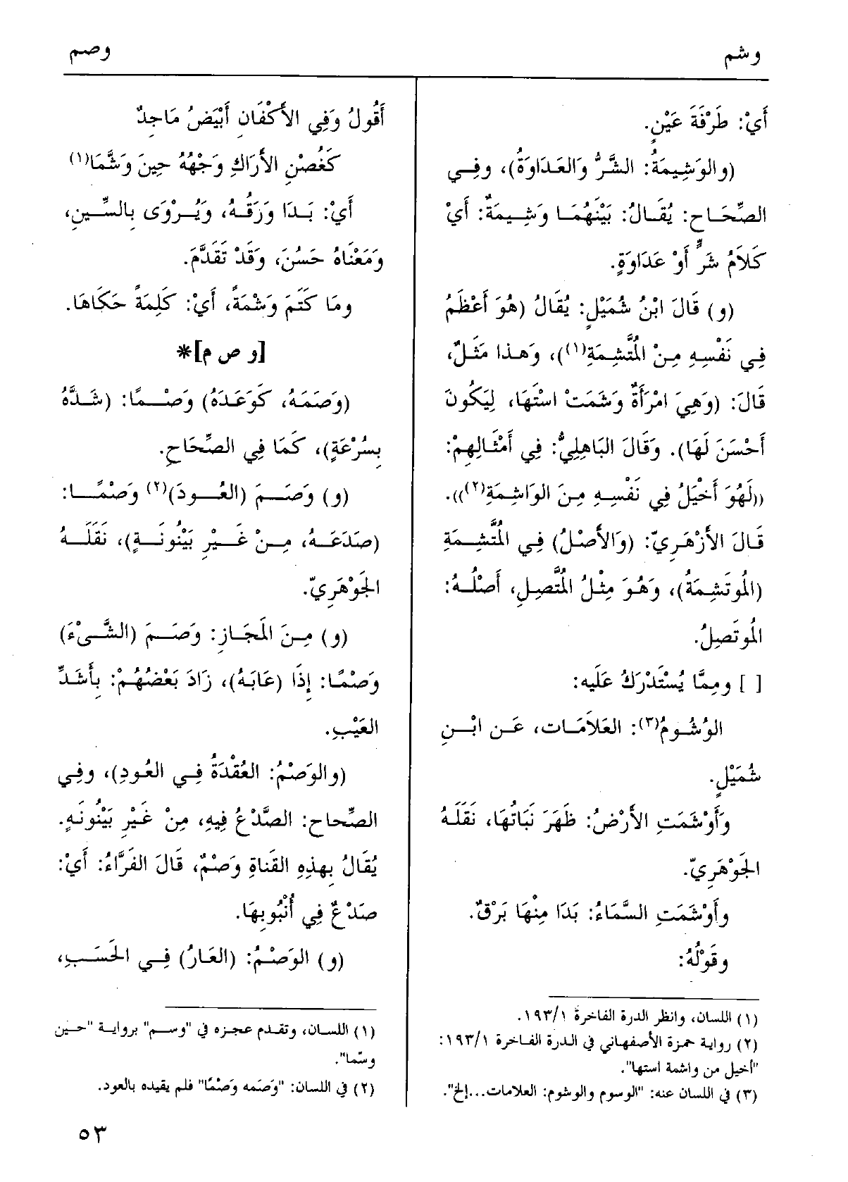أَيْ: طَرْفَةَ عَيْنٍ: ( {والوَشِيمَةٌ: الشَّرُّ وَالعَدَاوَةُ) ، وفِي الصِّحَاح: يُقَالُ: بَيْنَهُماَ} وَشِيمَةٌ: أَيْ كَلاَم شَرٍّ أَوْ عَدَاوَةٍ. (و) قَالَ ابْنُ شُمَيْلٍ: يُقَالُ (هُوَ أَعْظَمُ فِي نَفْسِهِ مِنْ {المُتَّشِمَةِ) ، وَهذا مَثَلٌ، قَالَ: (وَهِيَ امْرَأَةٌ} وَشَمَتْ اسْتَهَا، لِيَكُونَ أَحْسَنَ لَهَا) . وَقَالَ البَاهِلِيُّ: فِي أَمْثَالِهِمْ: ((لَهُوَ أَخْيَلُ فِي نَفْسِهَ مِنَ {الوَاشِمَةِ)) . قَالَ الأَزْهَرِيّ: (وَالأَصْلُ) فِي المُتَّشِمَةِ (} المُوتَشِمَةُ) ، وَهُوَ مِثْلُ المُتَّصِلِ، أَصْلُهُ: المُوتَصِلُ. [] ومِمَّا بُسْتَدْرَكُ عَلَيه: {الوُشُومُ: العَلاَمَات، عَن ابْنِ شُمِيْلٍ.} وَأَوْشَمَتِ الأَرْضُ: ظَهَرَ نَبَاتُها، نَقَلَهُ الجَوْهَرِيّ. وأَوْشَمَتِ السَّمَاءُ: بَدَا مِنْهَا بَرْقٌ. وقَوْلُهُ: أَقُولُ وَفِي الأَكْفَانِ أَبْيَضُ مَاجِدٌ كَغُصْنِ الأَرَاك وَجْهُهُ حِينَ {وَشَّمَا أَيْ: بَدَا وَرَقُهُ وَيُرْوَى بِالسِّينِ، وَمَعْنَاهُ حَسُنَ، وَقَدْ تَقَدَّمَ. ومَا كَتَمَ} وَشْمَةً، أَيْ. كَلِمةً حَكَاهَا.