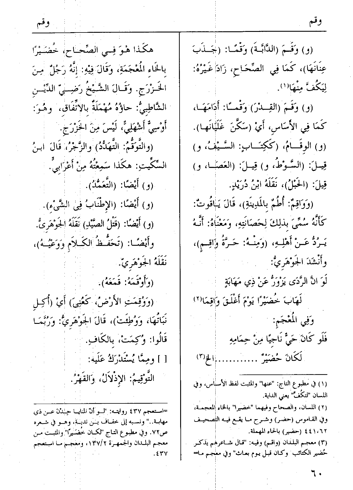 هَكَذَا هُوَ فِي الصِّحاح، خُضَيْرًا بِالْخَاءِ الْمُعْجَمَة، وَقَالَ فِيهِ: إِنَّه رَجُلٌ من الْخَزْرَج. وَقَالَ الشَّيْخ رضيّ الدِّين الشاطبي: حاؤه مُهْملَة بالِاتِّفَاقِ، وَهُوَ: أَوْسِيٌّ أشْهَلِيٌّ، لَيْسَ من الْخَزْرَج. ( {والتَّوَقُّمُ: التَّهَدُّدُ) والزَّجْرُ، قَالَ ابْن السِّكِّيت: هَكَذَا سمعته من أَعْرَابِي. (و) أَيْضا: (التَّعَمُّدُ) . (و) أَيْضا: (الإطناب فِي الشَّيْء) . (و) أَيْضا: (قتلُ الصَّيْدِ) نَقله الْجَوْهَرِي. وَأَيْضًا: (تَحَفُّظُ الْكَلَام وَوَعْيُهُ) ، نَقله الْجَوْهَرِي. (} وَأَوْقَمَهُ: قَمَعَهُ) . ( {وَوُقِمَتِ الأرضُ، كَعُنِىَ) أَي (أُكِلِ نباتُها، ووُطِئَتْ) ، قَالَ الْجَوْهَرِي: وَرُبمَا قَالُوا: وُكِمَتْ، بِالْكَاف. [] وَمِمَّا يسْتَدرك عَلَيْهِ:} التَّوْقيمُ: الإذلالُ، والقَهْرُ.