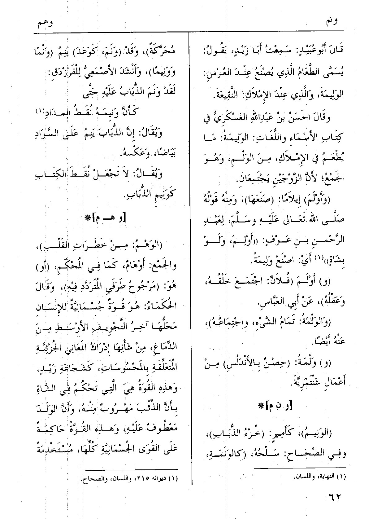قَالَ أَبُو عُبيد: سَمِعْتُ أَبَا زيد، يَقُول: يُسَمَّى الطَّعامُ الَّذِي يُصْنعُ عِنْد العُرْسِ: الوَلِيمَةَ، وَالَّذِي عِنْد الإمْلاكِ: النَّقِيعَةَ. وَقَالَ الْحسن بن عبد الله العسكري فِي كِتاب الْأَسْمَاء واللغات: {الوَلِيمَةُ: مَا يُطْعَمُ فِي الإملاك، مِنَ الوَلْمِ، وَهُوَ الجَمْعُ؛ لِأَن الزَّوْجين يَجْتَمِعَانِ. (} وَأَوْلَمَ) إِيلامًا: (صَنَعَها) ، وَمِنْه قَوْله