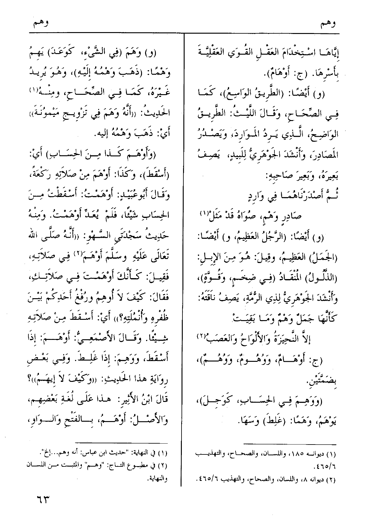 (إلاًّ النَّحِيزَةُ وَالأَلْوَاحُ وَالعَصَبُ (ج: أَوْهَامٌ،} وَوُهُومٌ، {وَوُهُمٌ) ، بِضَمَّتَيْنِ. (} وَوَهِمَ فِي الحِسَابِ، كَوَجِلَ) ، {يَوْهَمُ،} وَهَماً: (غَلِطَ) وَسَهَا. (و) {وَهَمَ (فِي الشَّىْءِ، كَوَعَد) } يَهِمُ وَهْماً: (ذَهَبَ {وَهْمُهُ إِلَيْهِ) ، وَهُوَ يُرِيدُ غَيْرَهُ، كَمَا فِي الصِّحَاحِ، ومِنْهُ الحَدِيثُ: ((أَنَّهُ وَهَمُ فِي تَزْوِيجِ مَيْموُنَةَ)) أَيْ: ذَهَبَ وَهْمُهُ إِلَيْهِ. (} وَأَوهَمَ كَذا مِنَ الحِسَابِ) أَيْ: (أَسْقَط) ، وَكَذَاَ: {أَوْهَمَ مِنْ صَلاَتِهِ رَكْعَةً، وَقَالَ أَبُو عُبَيْدٍ:} أَوْهَمْتُ: أَسْقَطْتُ مِنَ الحِسَابِ شَيْئاً، فَلَمْ يَعَدِّ أَوْهَمْتُ، وَمِنْهُ حَدِيثُ سَجْدَتَيِ السَّهْوِ: ((أَنَّهُ صَلَّى الله تَعَالَى عَلَيْهِ وسَلَّمَ أَوْهَمَ فِي صَلاَتِهِ، فَقِيلَ: كَأَنّكَ أَوْهَمْتَ فِي صَلاَتكِ فَقَالَ: كَيْفَ لاَ {أُوهِمُ ورُفْغُ أَحَدِكُمْ بَيْنَ ظُفْرِهِ وَأُنْمُلَتِه؟)) أَيْ: أَسْقَطَ مِنْ صَلاَتِهِ شِيْئاً. وَقَالَ الأَصْمَعِيُّ: أَوْهَمَ: إِذَا أَسْقَطَ، وَوَهِمَ، إِذاَ غَلِطَ. وَفِي بَعْض رِوَاية هَذَا الحَدِيثِ: ((وَكَيْفَ لاَ} إِيَهُم)) ؟ قَالَ ابْنُ الأَثَيرِ: هَذَا عَلَى لُغَةِ بَعْضِهم، وَالأَصْلُ:! أَوْهَمُ، بِالفَتْحِ وَالوَاوِ،
