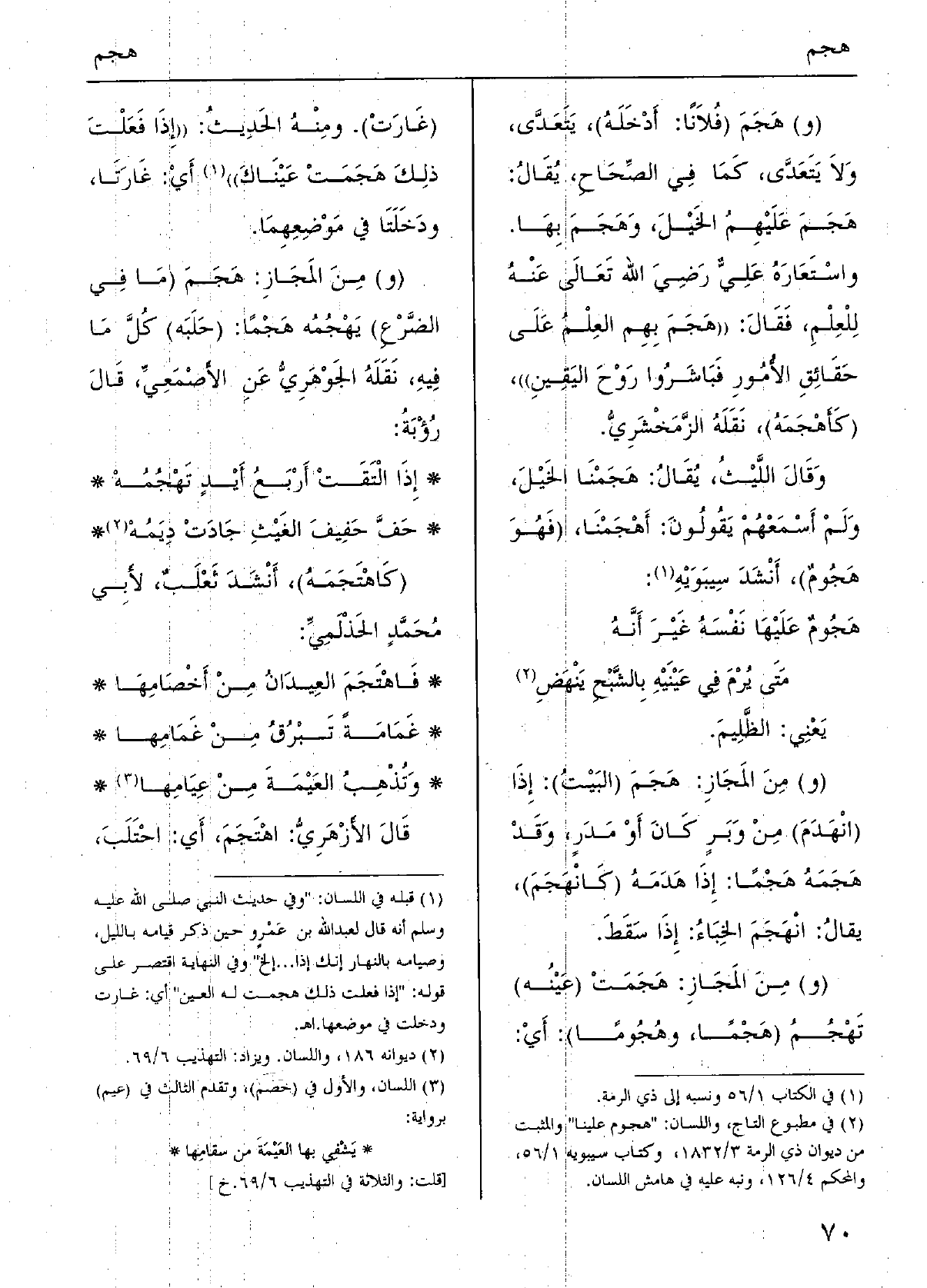 يَعْنِي: الظَّليمَ. (و) من الْمجَاز: هَجَمَ (البيتُ) : إِذا (انْهَدَمَ) من وَبَرٍ كَانَ أَو مدرٍ، وَقد هَجَمَهُ هَجْمًا: إِذا هَدَمَهُ (كانْهَجَمَ) ، يُقَال: انْهَجَمَ الخِباءُ: إِذا سَقَطَ. (و) من الْمجَاز: هَجَمَتْ (عَيْنُه) تَهْجُم (هَجْمًا، وهُجُومًا) : أَي: (غَارَتْ) . وَمِنْه الحَدِيث: ((إِذا فَعَلْتَ ذَلِك هَجَمَتْ عَيْناكَ)) أَي: غَارَتا، ودَخَلتا فِي موضِعِهَما. (و) من الْمجَاز: هجم (مَا فِي الضَّرْعِ) يَهْجُمُه هَجْمًا: (حَلَبه) كل مَا فِيهِ، نَقله الْجَوْهَرِي عَن الْأَصْمَعِي، قَالَ رُؤبة: