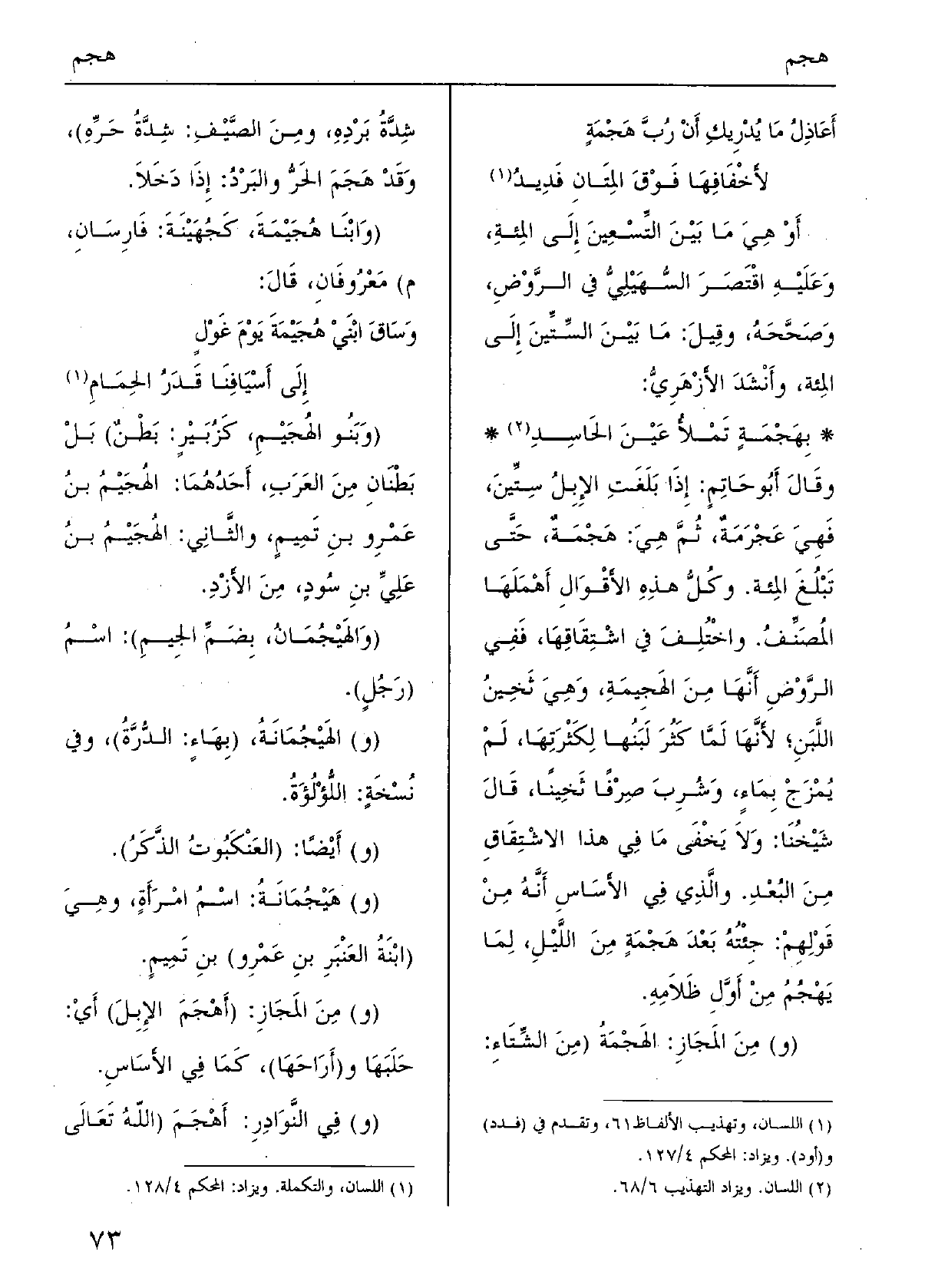 وقَالَ أَبُو حَاتِم: إِذَا بَلَغَتِ الإِبِلُ سِتِّينَ، فَهيَ عَجْرَمَةٌ، ثُمَّ هِيَ: هَجْمَةٌ، حَتّى تَبْلُغَ المِئة. وكُلُّ هذِهِ الأَقْوَالِ أَهْمَلَها المُصَنِّفُ. واخْتُلِفَ فِي اشْتِقَاقِهَا، فَفِي الرَّوْضِ أنَّهَا مِنَ الهَجِيمَةِ، وَهِيَ ثَخِينُ اللَّبَنِ؛ لأَنَّها لَمَّا كَثُرُ لَبَنُها لِكَثْرَتِهَا، لَمْ يُمْزَج بِمَاءٍ، وَشُرِبَ صِرْفاً ثَخِيناً، قَالَ شَيْخُناً: وَلاَ يَخْفَى مَا فِي هَذَا الاشْتِقَاقِ مِنَ البُعْدِ. والَّذيِ فِي الأَسَاسِ أَنَّهُ مِنْ قَوْلِهمْ: جِئْتُهُ بَعْدَ هَجْمَةٍ مِنَ اللَّيْلِ، لِمَا يَهْجُمُ مِنْ أَوَّل ظَلاَمِهِ. (و) مِنَ المَجَاز: الهَجْمَةُ (مِنَ الشِّتَاءِ: شِدَّةُ بَرْدِهِ، ومِنَ الصَّيْفِ: شِدَّةُ حَرِّهِ) ، وَقَدْ هَجَمَ الحَرُّ والبَرْدُ: إِذَا دَخَلاَ. (وَابُنَا هُجَيْمَةَ، كَجُهَيْنَةَ: فَارِسَانِ، م) مَعْرُوفَانِ، قَالَ: