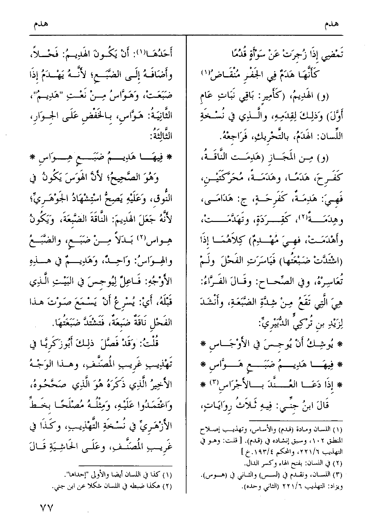 تَمْضِي إِذَا زُجِرَتْ عَنْ سَوْأَةٍ قُدُماً كَأَنَّهَا هَدَمٌ فِي الجَفْرِ مُنْقَاضُ (و) الهَديِمُ، (كَأَمِيرٍ: بَاقِي نَبَاتِ عَامِ أَوَّلَ) وَدِلكَ لِقَدَمِهِ، والَّذِي فِي نُسْخَةٍ اللِّسان: الهَدَمُ، بالتَّحْرِيكِ، فَرَاجِعْهُ (و) مِن المَجَازِ (هَدِمَت النَّاقَةُ، كَفَرحَ، هَدَماً، وهَدَمَةً، مُحَركَتَيْنِ، فَهِيَ، هَدِمَةٌ، كَفَرحَةٍ، ج: هَدَامَى، وهِدَمتْ، فهِيَ مُهْدِمٌ) كِلاَهُمَا إِذَا (اشْتَدَّتْ ضَبْعَتُها) فَيَاسَرَتِ الفَحْلَ ولَمْ تُعَاسِرْهُ، وَفِي الصِّحاح: وقَالَ الفَرَّاءُ: هِيَ الَّتِي تَقَعُ مِنْ شِدَّةِ الضَّبَعَةِ، وأَنْشَدَ لِزَيْدِ بنِ تُرْكِيٍّ الدُّبَيْرِيِّ: يُوشِكُ أَنْ يُوجِسَ فِي الأَوْجَاسِ فِيهَا هَدِيمُ ضَبَعٍ هَوَّاسِ إِذَا دَعَا العُنَّدَ بالأحْرَاسِ قَالَ ابنُ جِنِّي: فِيهِ ثَلاُثُ رِوَايَاتٍ، أَحَدُها: أَن يَكُونَ الهَدِيمُ: فَحْلاً، وأَضَافَهُ إِلَى الضَّبَعِ؛ لأنَّه يَهْدمُ إِذَا ضَبَعَتْ، وَهَوَّاسُ مِنْ نَعْتِ " هَدِيمُ "، الثَّانِيَةُ: هَوَّاسِ، بِالخَفْضِ عَلَى الجِوَارِ، الثَّالِثَةُ: فِيهَا هَدِيمُ ضَبَعٍ هِوَاسِ وَهُوَ الصَّحِيحُ؛ لأَنَّ الهَوَسَ يَكُونُ فِي النُّوقِ، وَعلَيْهِ يَصِحُّ اسْتِشَهَادُ الجَوْهَرِيِّ؛ لأنًّهُ جَعَلَ الهَدِيِمَ: النَّاقَةَ الضَّبِعَةَ، وَيَكُونُ هِواس بَدَلاً مِنْ ضِبَعٍ، والضَّبَعُ والهِوَاسُ: وَاحِدٌ، وهَدَيِمٌ فِي هذِهِ الأَوْجُهِ: فَاعِلٌ لِيُوجِسَ فِي البَيْتِ الَّذِي قَبْلُه، أَيْ: يُسْرِعُ أِنْ يَسْمَعَ صَوْتَ هَذَا الفَحْلِ نَاقَةٌ ضَبَعَة، فَتَشْتَدَّ ضَبَعَتُهَا. قُلْتُ: وَقَدْ فَصَّلَ ذِلكَ أَبُو زَكَرِيَّا فِي تَهْذِيبِ غَرِيبِ المُصَنَّفِ، وَهَذَا الوَجْهُ الأَخِيرُ الَّذي ذَكَره هَوَ الَّذِي صَحَّحُوهُ، وَاعْتَمَدُوا عَلِيْهِ، وَمِثْلُهُ مُصْلَحاً بِخَطِّ غَرِيبِ المُصَنَّفِ، وَعلَى الحَاشِيَةِ قَالَ