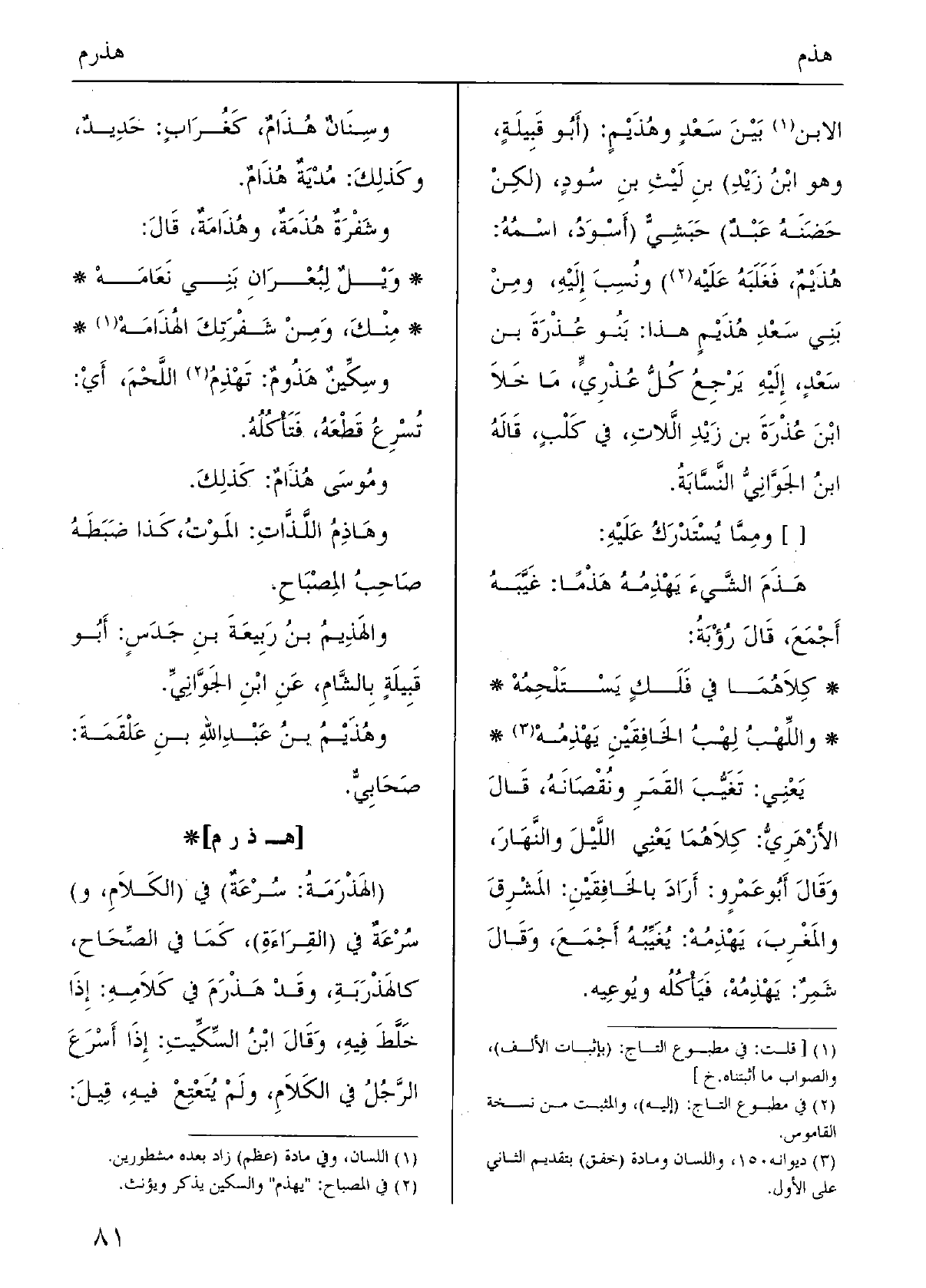 الابْن بَيْنَ سَعْدٍ وهُذَيْمٍ: (أَبُو قَبِيلَةٍ، وَهُوَ ابنُ زَيْدِ) بنِ لَيثِ بن سُودٍ، (لكنْ حَضَنَهُ عَبْدٌ) حَبَشِيٌّ (أَسْوَدُ، اسمهُ: هُذَيْمٌ، فَغَلَبَهُ عَلَيْه) ونُسِبَ إليهِ، ومِنْ بَنِي سعْدِ هُذَيْمٍ هَذَا: بَنُو عُذْرَةَ بن سعدٍ، إليَهِ يَرْجِعُ كُلُّ عُذْرِيٍّ، مَا خَلا ابْن عُذْرَةَ بن زَيْدِ اللاتِ، فِي كَلبٍ، قَالَه ابنُ الجَوَّانِيُّ النَّسَّابَةُ. [] ومِمَّا يُسْتَدْرَكُ عَلَيْهِ: هَذَمَ الشيءَ يهْذِمُهُ هذْماً: غَيَّبَهُ أجْمعَ، قَالَ رُؤْبَةُ: