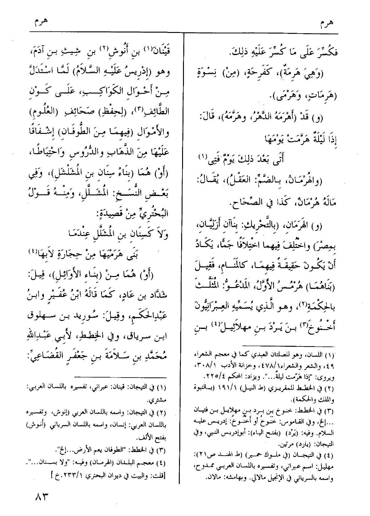 (والهَرْمانُ، بِالضَّمِّ: العَقْلُ) ، يقالُ: مَا لَهُ هَرْمَانٌ، كَذَا فِي الصِّحَاح. (و) الهَرَمَانِ، (بالتَّحرِيكِ: بِنَاآنِ أزَلِيَّانِ، بمصْرَ) واختُلِفَ فِيهما اخْتِلافاً جَمًّا، يكادُ أَنْ يَكُونَ حَقِيقَةً فِيهِمَا، كالمَنَامِ، فَقِيلَ (بَنَاهُمَا) هُرْمُسُ الأوَّلُ، المَدْعُوُّ: المُثَلَّثَ بالحِكْمَةِ، وَهُوَ الَّذِي يُسَمِّيهِ العِبْرَانِيُّونَ أَخْنُوخَ بنَ يَرْدَ بنِ مهلاَئِيلَ بنِ قَيْناَنَ بنِ أَنُوشِ بنِ شِيثِ بنِ آدَمَ، وَهُوَ (إِدْرِيسُ عَلَيهِ السَّلامُ) لَمَّا اسْتَدَلَّ مِنْ أَحْوَالِ الكَوَاكِبِ، عَلَى كَوْنِ الطِّائِفِ، (لِحِفْظِ) صَحَائف (العُلُومِ) والأَمْوَالِ (فِيهِمَا مِنَ الطُّوفَانِ) إشْفَاقًا عَلَيْهَا مِنَ الذَّهَابِ والدُّرُوسِ واحْتِيَاطاً، (أَو) هُمَا (بِنَاءُ سِنَانِ بِن المُشَلْشَلِ) ، وَفِي بعضِ النُّسَخِ: المُشَلَّلِ، ومِنْهُ قَوْلُ البُحْتُرِيِّ مِن قصيدة: