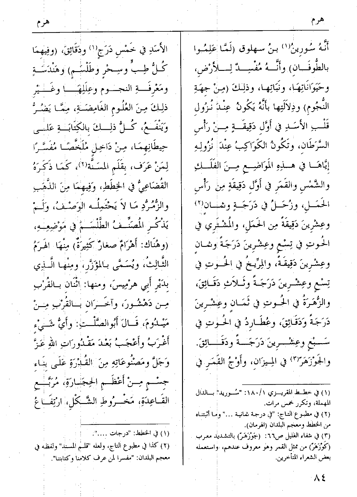 أَنه سُورِينُ بن سهلوق (لما علمُوا بالطوفان) وَأَنه مُفسِدٌ للأرضِ، وحيواناتها، ونباتِها، وَذَلِكَ (من جِهَة النُّجوم) ودلالتها بِأَنَّهُ يكون عِنْد نُزولِ قلبِ الأسَدِ فِي أول دقيقة من رَأس السَّرطان، وتكونُ الكَواكِبُ عِنْد نُزُوله إِيَّاهَا فِي هَذِه الْمَوَاضِع من الفَلَكِ وَالشَّمْس وَالْقَمَر فِي أول دقيقة من رأسِ الحَمَلِ، وزُحل فِي درجةٍ وثمانٍ وعِشرينَ دقيقةً من الحَمَلِ، والمُشتري فِي الْحُوت فِي تِسعٍ وعشرينَ دَرَجَة وثمانٍ وعِشرين دقيقةً، والمرِّيخ فِي الحوتِ فِي تِسعٍ وعِشرينَ دَرَجَة وثلاثِ دقائِقَ، والزُّهَرَةُ فِي الْحُوت فِي ثمانٍ وعِشرينَ دَرَجَة ودقائق، وعُطارد فِي الْحُوت فِي سبعٍ وعشرينَ دَرَجَة ودقائق. والجَوْزَهَرّ فِي الْمِيزَان، وأوْجُ الْقَمَر فِي الْأسد فِي خمس دَرَجٍ ودقائق، (وَفِيهِمَا كلُّ طِبٍّ وسِحرٍ وطَلْسَمٍ) وهندسةٍ ومعرفةِ النُّجُوم وعِلَلِهَا وَغير ذَلِك من الْعُلُوم الغامضةِ، مِمَّا يَضُرُّ وينفعُ، كل ذَلِك بِالْكِتَابَةِ على حيطانهما، من دَاخل مُلخَّصًا مفسَّرًا لمن عَرَف، بقلم المسنَّة، كَمَا ذكره القُضاعي فِي الخِطط، وَفِيهِمَا من الذَّهب والزُّمُرُّد مَا لَا يحْتَملهُ الْوَصْف، وَلم يذكر المصنِّف الطَّلْسم فِي مَوْضِعه، (وَهُنَاكَ: أهرامٌ صغارٌ كثيرةٌ) مِنْهَا الهَرَمُ الثَّالِث، وَيُسمى بالمؤزَّر، وَمِنْهَا الَّذِي بدَيْر أبي هرْميس، وَمِنْهَا: اثْنَان بِالْقربِ من دَهْشورَ، وآخران بِالْقربِ من مَيْدومَ، قَالَ أَبُو الصَّلت: وَأي شَيْء أغربُ وأعجبُ بعد مقدورات الله عز وَجل ومصنوعاتِهِ من القُدرة على بِناءِ جسمٍ من أعظم الْحِجَارَة، مربَّع القاعِدَةِ، مخروطِ الشَّكْلِ، ارتفاعُ