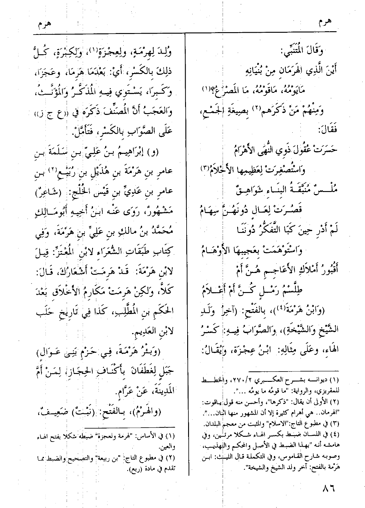 (وَابْن هَرْمَةَ) ، بِالْفَتْح: (آخر ولد الشَّيخ والشَّيخة) ، وَالصَّوَاب فِيهِ: كسر الهاءِ، وعَلى مِثَاله: ابْن عِجْزَة، وَيُقَال: وُلِدَ لِهِرْمَةً، ولعِجْزَةً، ولكِبْرَةٍ، كل ذَلِك بِالْكَسْرِ، أَي: بَعْدَمَا هَرِمَا، وعَجَزَا، وكَبِرا، يَسْتَوِي فِيهِ الْمُذكر والمؤنث، وَالْعجب أَن المُصَنّف ذكره فِي ((ع ج ز)) على الصَّوَاب بِالْكَسْرِ، فَتَأمل. (و) إِبْرَاهِيم بن عَليّ بن سَلمَة بن عَامر بن هَرْمَةَ بن هُذيل بن ربيع بن عَامر بن عدي بن قيس الخُلْجِ: (شاعرٌ) مشهورٌ، روى عَنهُ ابْن أَخِيه أَبُو مَالك مُحَمَّد بن مَالك بن عَليّ بن هَرْمَةَ، وَفِي كتاب طَبَقَات الشُّعَرَاء لِابْنِ المعتز: قيل لِابْنِ هَرْمَةَ: قد هَرِمَتْ أشعارُكَ، قَالَ: كلا، وَلَكِن هَرِمَتْ مَكَارِم الْأَخْلَاق بعد الحكم بن الْمطلب، كَذَا فِي تَارِيخ حلب لِابْنِ العديم. (وبئر هَرْمَةَ، فِي حزم بني عَوالٍ) جبل لغطفان بِأَكْنَافِ الْحجاز، لمن أم الْمَدِينَة، عَن عَرَّام. (والهَرْمُ) ، بِالْفَتْح: (نبتٌ) ضعيفٌ،