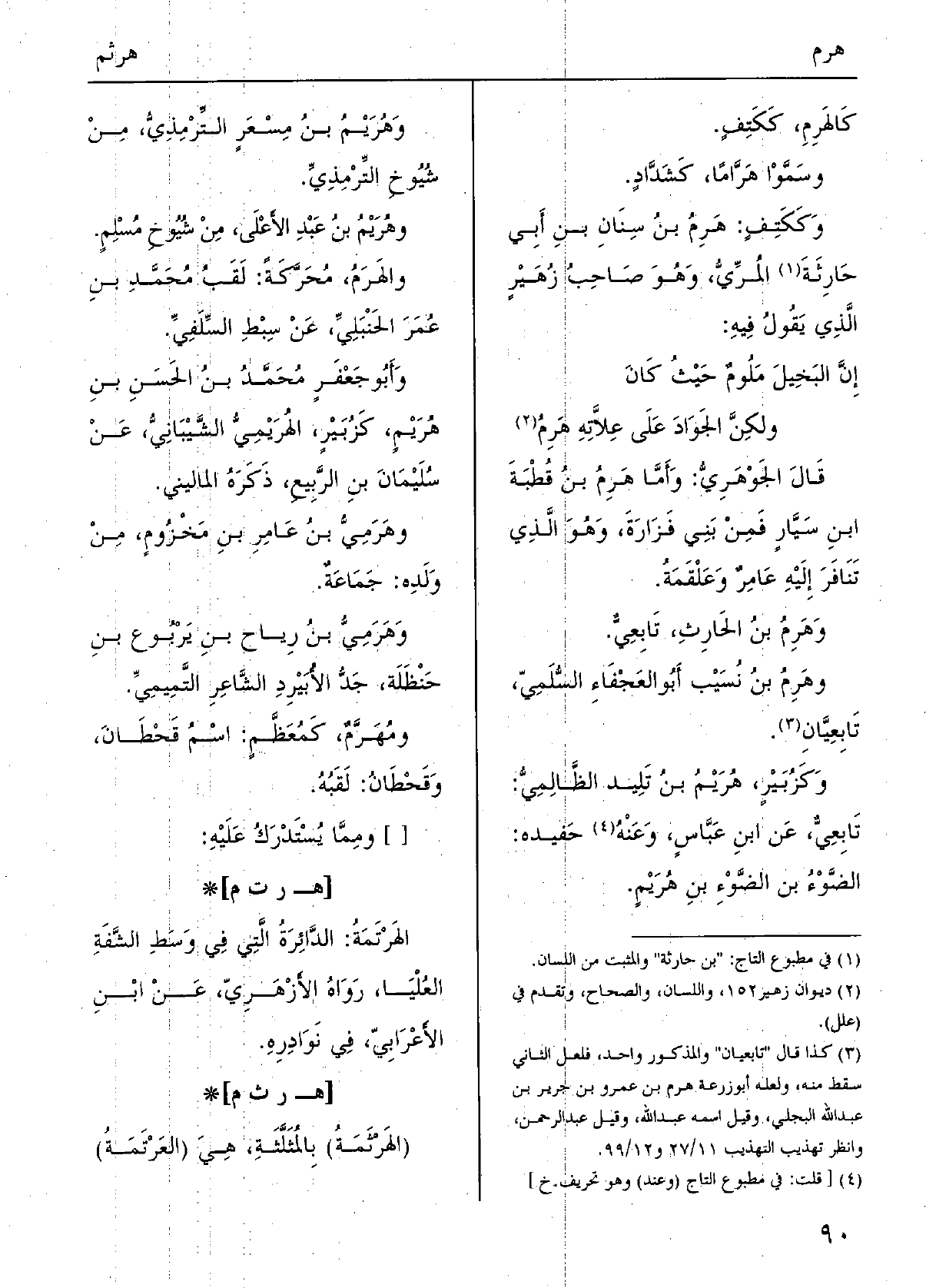 قَالَ الْجَوْهَرِي: وَأما هَرِمُ بن قُطْبة ابْن سيَّار فمِنْ بني فَزَارَة، وَهُوَ الَّذِي تَنافر إِلَيْهِ عامِرٌ وعَلْقمة. وهَرِمُ بن الْحَارِث، تابعيٌّ. وهَرِمُ بن نُسيب أَبُو الْعَجْفَاء السُّلَمِيّ، تابعيَّان. وكزبير، هُرَيْمُ بن تَليد الظَّالِميُّ: تابِعيٌّ، عَن ابْن عَبَّاس، وَعنهُ حفيده: الضَّوْءُ بن الضَّوْء بن هُرَيْمٍ. وهُرَيْمُ بن مِسْعَرٍ التِّرْمِذِيّ، من شُيُوخ التِّرْمِذِيّ. وهُرَيْمُ بن عبد الْأَعْلَى، من شُيوخ مُسْلم. والهَرَمُ: محركة: لقب مُحَمَّد بن عمر الْحَنْبَلِيّ، عَن سِبْطِ السِّلَفِي. وَأَبُو جَعْفَر مُحَمَّد بن الْحسن بن هُرَيْمٍ، كزبير، الهُرَيْمِيُّ الشَّيْبَانِيّ، عَن سُلَيْمَان بن الرّبيع، ذكره الْمَالِينِي. وهَرَمِيُّ بن عَامر بن مَخزومٍ، من وَلَده: جماعةٌ. وهَرَمِيٌّ بن ريَاح بن يَرْبُوع بن حَنْظلة، جدُّ الأُبَيْرِدِ الشَّاعِر التَّميمي. ومُهَرَّمٌ، كَمُعَظَّمٍ: اسْم قحطانَ، وقَحطانُ: لقبه. [] وَمِمَّا يسْتَدرك عَلَيْهِ.