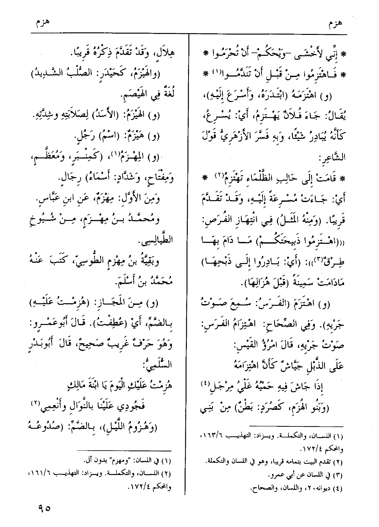 (وبَنُو الهُزَمِ، كَصُرْدٍ: بَطْنٌ) مِنْ بَنِي هِلاَلٍ، وَقَدْ تَقَدَّمَ ذِكْرُهُ قَرِيباً. (والهَيْزَمُ، كَحَيْدرٍ: الصُّلْبُ الشَّديدُ) لُغَةٌ فِي الهَيْصَمِ. (و) الهَيْزَمُ: (الأَسَدُ) لِصَلاَبَتِهِ وشِدَّتِهِ. (و) هيزم: (اسْم) رجل (و) المِهْزَمُ، (كَمِنْبَرٍ، وَمُعَظَّمٍ، وَمِفْتَاحٍ، وَشَدَّادٍ: أَسْمَاءُ) رِجَالٍ. وَمِنَ الأَوَّلِ: مِهْزَمٌ، عنِ ابنِ عَبَّاسٍ. ومُحمَّدُ بنُ مِهْزَمٍ: مِنْ شُيُوخِ الطَّيالِسي. وبَقِيَّةُ بنُ مِهْزمٍ الطُّوسِي، كَتَبَ عَنْهُ مُحَمَّدُ بنُ أَسْلَمَ. (و) مِنَ المَجَازِ: (هُزِمْتُ عَلَيْهِ) بِالضَّمِّ، أَيْ (عُطِفَتُ) . قَالَ أَبُو عَمْرٍ و: وَهُوَ حَرْفٌ غَرِيبٌ صَحِيحٌ، قالَ أبُو بَدْرٍ السُّلَمِيُّ: