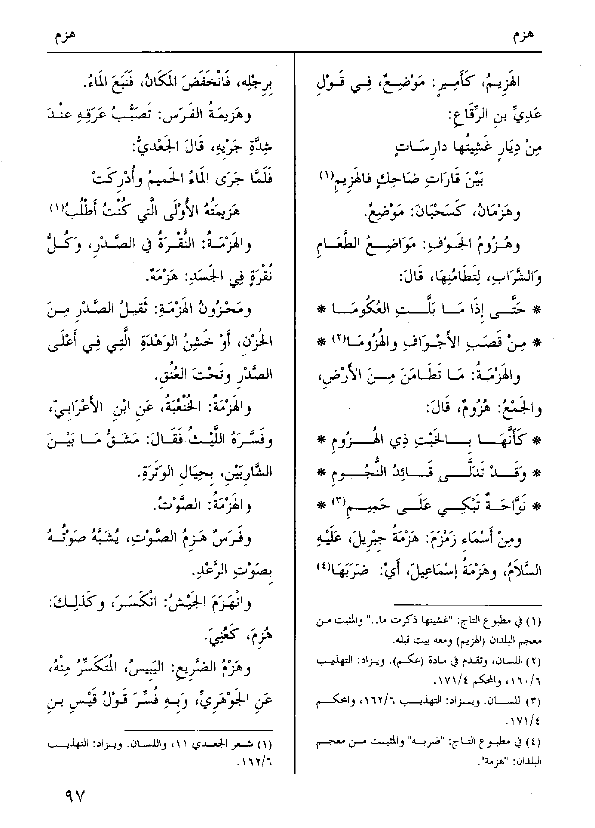 ومنْ أسْمَاءِ زَمْزَمَ: هَزْمَةُ جِبْرِيلَ، عَلَيْهِ السَّلاَمُ، وهَزْمَةُ إِسْمَاعِيلَ، أيْ: ضَرَبَهَا بِرِجْلِه، فَانْخَفَضَ المَكَانُ، فَنَبَعَ المَاءُ. وهَزيمَةُ الفَرَس: تَصَبُّبُ عَرَقِهِ عنْدَ شِدَّةِ جَرْيِهِ، قالَ الجَعْديُّ: