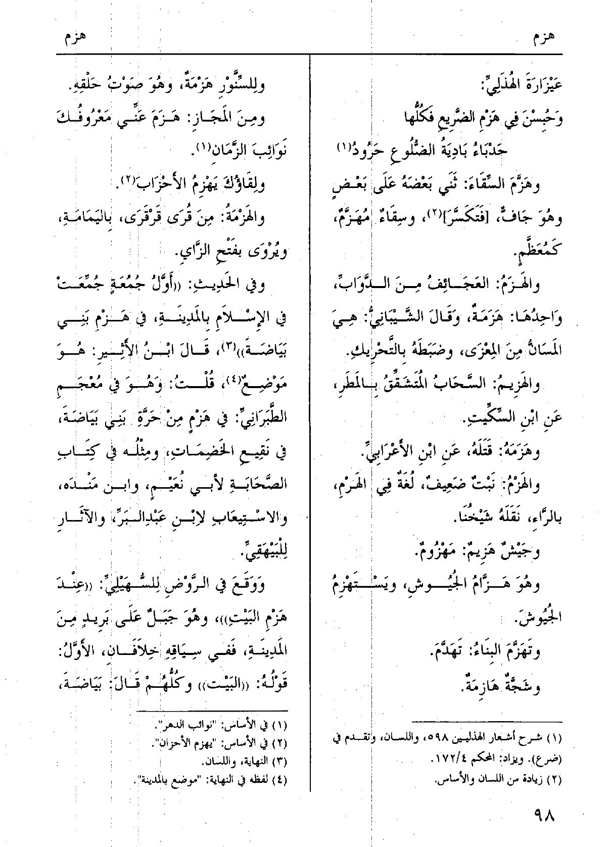وهَزَّمَ السِّقاء: ثني بعضه على بعض وَهُوَ جَاف، [فتكسَّرَ] ، وسقاءٌ مُهَزَّمٌ، كمُعظَّم. والهَزَمُ: العَجائِفُ من الدَّوَابّ، وَاحِدهَا: هَزَمَةٌ، وَقَالَ الشَّيْبَانِيّ: هِيَ المسَانُّ من المِعْزى، وَضَبطه بِالتَّحْرِيكِ. والهَزِيمُ: السَّحَاب المُتَشَقِّقُ بالمطر، عَن ابْن السّكيت. وهَزَمَهُ: قَتَلَهُ، عَن ابْن الْأَعرَابِي. والهَزْمُ: نبْتٌ ضعيفٌ، لُغَة فِي الهَرْمِ، باراء، نَقله شَيخنَا. وجيشٌ هَزيمٌ: مَهْزومٌ. وَهُوَ هزَّامُ الجيوشِ، ويَسْتَهْزِمُ الجيوش. وتَهَزَّمَ الْبناء: تَهَدَّمَ. وشَجَّةٌ هَازِمَةٌ. وللسَّنور هَزْمَةٌ، وَهُوَ صوتُ حَلْقِهِ. وَمن الْمجَاز: هَزَمَ عَنِّي مَعْرُوفك نَوَائِب الزَّمَان. ولقاؤك يَهْزِمُ الأحزابَ. والهَزْمَةُ: من قُرى قَرْقَرى، باليمامةِ، ويُروى بِفَتْح الزَّاي. وَفِي الحَدِيث: ((أولُ جُمُعَةٍ جُمِّعَتْ فِي الْإِسْلَام بِالْمَدِينَةِ، فِي هَزْمِ بني بياضة)) ، قَالَ ابْن الْأَثِير: هُوَ مَوضِع، قلت: وَهُوَ فِي مُعْجم الطَّبَرَانِيّ: فِي هَزْمٍ من حَرَّةِ بني بياضةَ، فِي نقيعِ الخَضِماتِ، ومِثْلُه فِي كتاب الصَّحَابَة لأبي نعيم، وَابْن مَنْدَه، والاستيعاب لِابْنِ عبد الْبر، والْآثَار للبيهقيِّ. وَوَقع فِي الرَّوض للسُّهَيْلي: ((عِنْد هَزْمِ البيتِ)) ، وَهُوَ جَبَلٌ على بريدٍ من الْمَدِينَة، فَفِي سِيَاقه خلافان، الأول: قَوْله: ((الْبَيْت)) وَكلهمْ قَالَ: بياضَةَ،