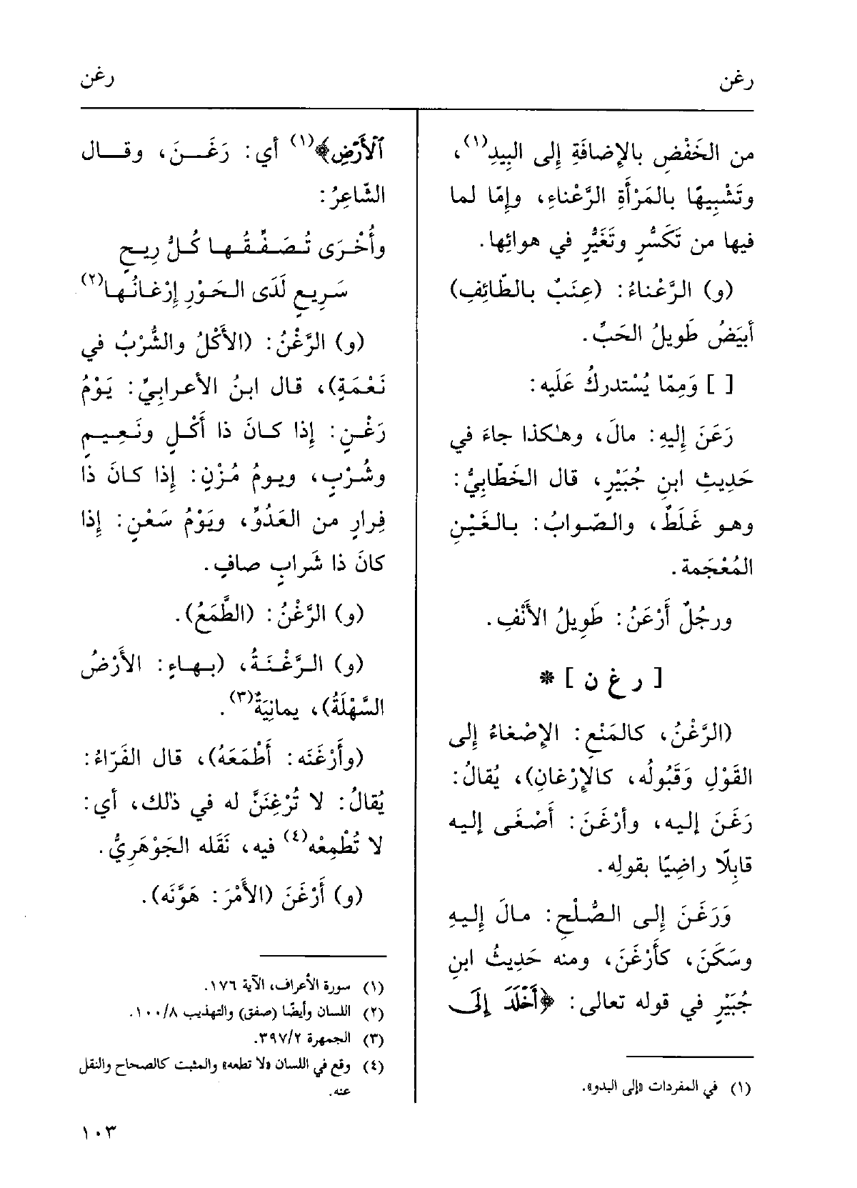 وأُخْرَى تُصَفِّقُها كلُّ رِيحٍ سريعٍ لَدَى الحَوْرِ إِرْغانُهاو) الرَّغنُ) (الأَكْلُ والشُّرْبُ فِي نَعْمَةٍ) .