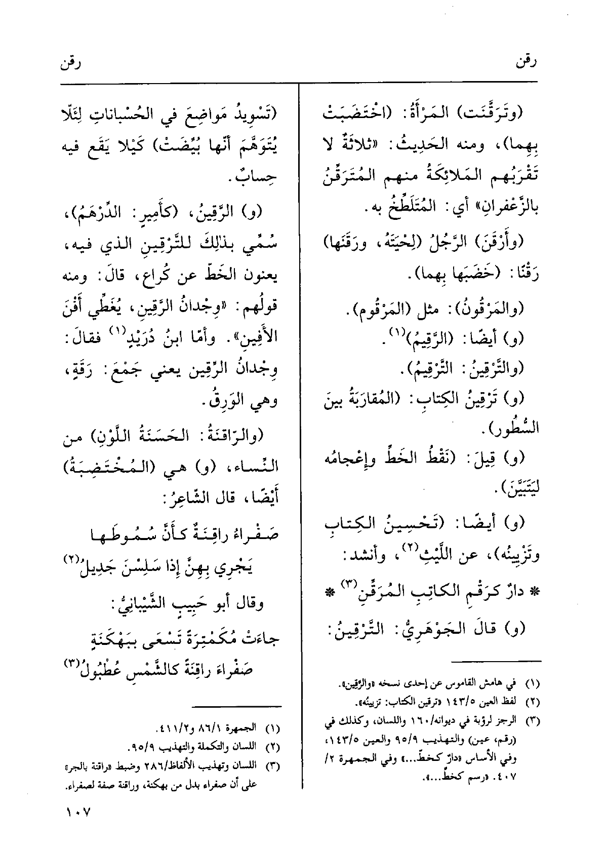 دَار كَرَقْمِ الكابتِ المُرَقِّنِ (و) قالَ الجوْهرِيُّ: التَّرْقينُ: (تَسْويدُ مواضعَ فِي الحُسْباناتِ لِئلاَّ يُتَوَهَّمَ أَنَّها بُيِّضَتْ) كيْلاَ يَقَعَ فِيهِ حِسَاب.