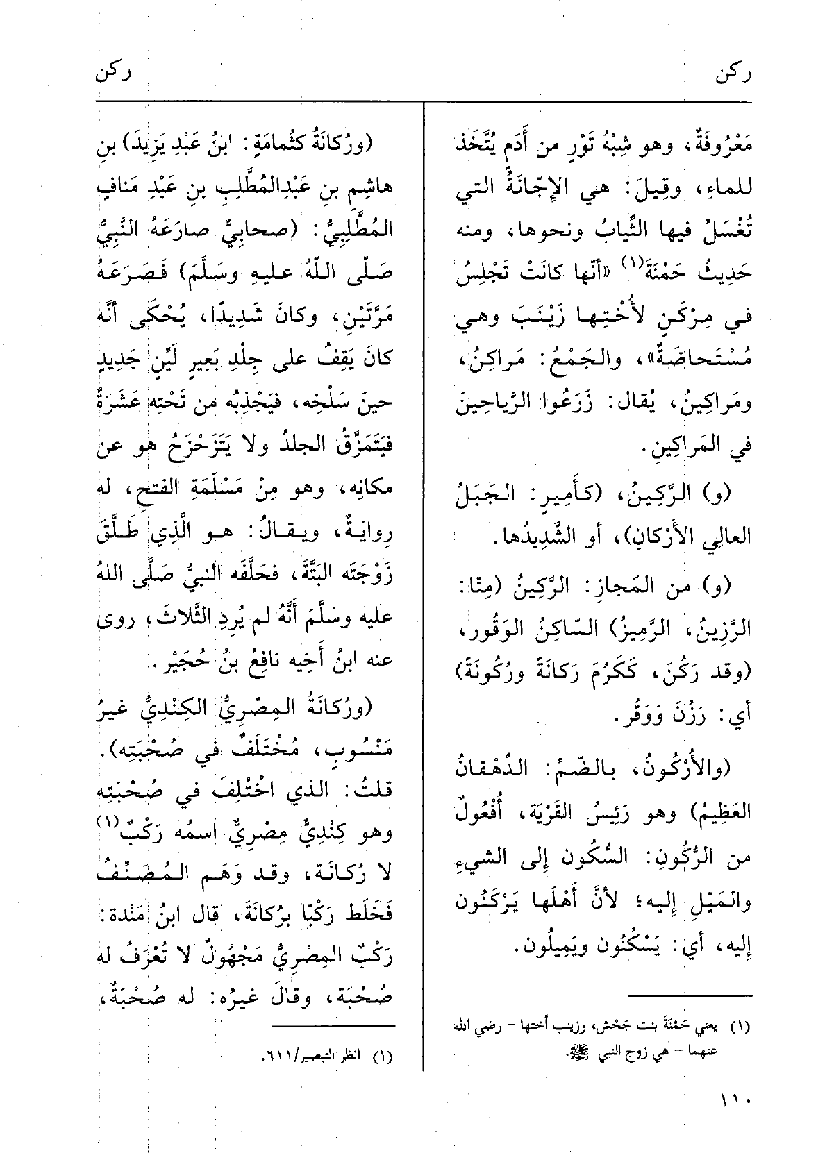 (والأُرْكُونُ، بالضَّمِّ: الدِّهْقَانُ العظيمُ) ، وَهُوَ رَئيسُ القَرْيةِ، أُفْعُولٌ مِن الرُّكُونِ السّكُون إِلَى الشَّيءِ والمَيْلُ إِلَيْهِ، لأَنَّ أَهْلَها يَرْكَنُونَ إِلَيْهِ، أَي يسْكنُونَ ويميلُونَ (ورُكَانَةُ، كثُمامَةٍ: ابنُ عبْدِ يَزيدَ) بنِ هاشِمِ بنِ عبْدِ المُطَّلِبِ بنِ عبْدِ منافٍ المطلبيّ (صَحابيٌّ صارَعَهُ النَّبيُّ، صلى الله عَلَيْهِ وَسلم، فصَرَعَهُ مَرَّتَيْن وكانَ شَدِيداً، يُحْكَى أنّه كانَ يقفُ على جلدِ بَعِيرٍ لَيِّن جَديدٍ حِين سَلَخَه فيَجْذبُه من تحْتهِ عشرَةً فيَتَمَزَّقُ الجلْدُ وَلَا يَتَزَحْزَحُ هُوَ عَن مكانِهِ، وَهُوَ مِن مسْلِمَةِ الفتْحِ، لَهُ رِوايَةٌ؛ ويقالُ: هُوَ الَّذِي طلَّقَ زوْجَتَه البتّةَ فخلفه النبيّ، صلى الله عَلَيْهِ وَسلم أنَّه لم يرد الثلاثَ؛ رَوَى عَنهُ ابنُ أَخيهِ نافِعُ بنُ حجيرٍ.