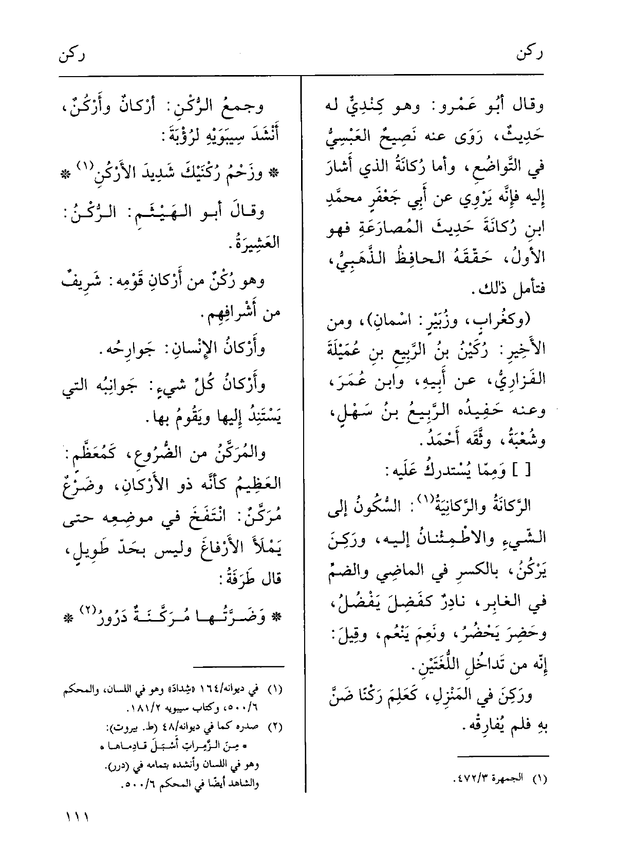 وزَحْمُ رُكْنَيْكَ شَدِيدَ الأَرْكُنِ وقالَ أَبو الهَيْثم: الرُّكْنُ العَشِيرَةُ.
