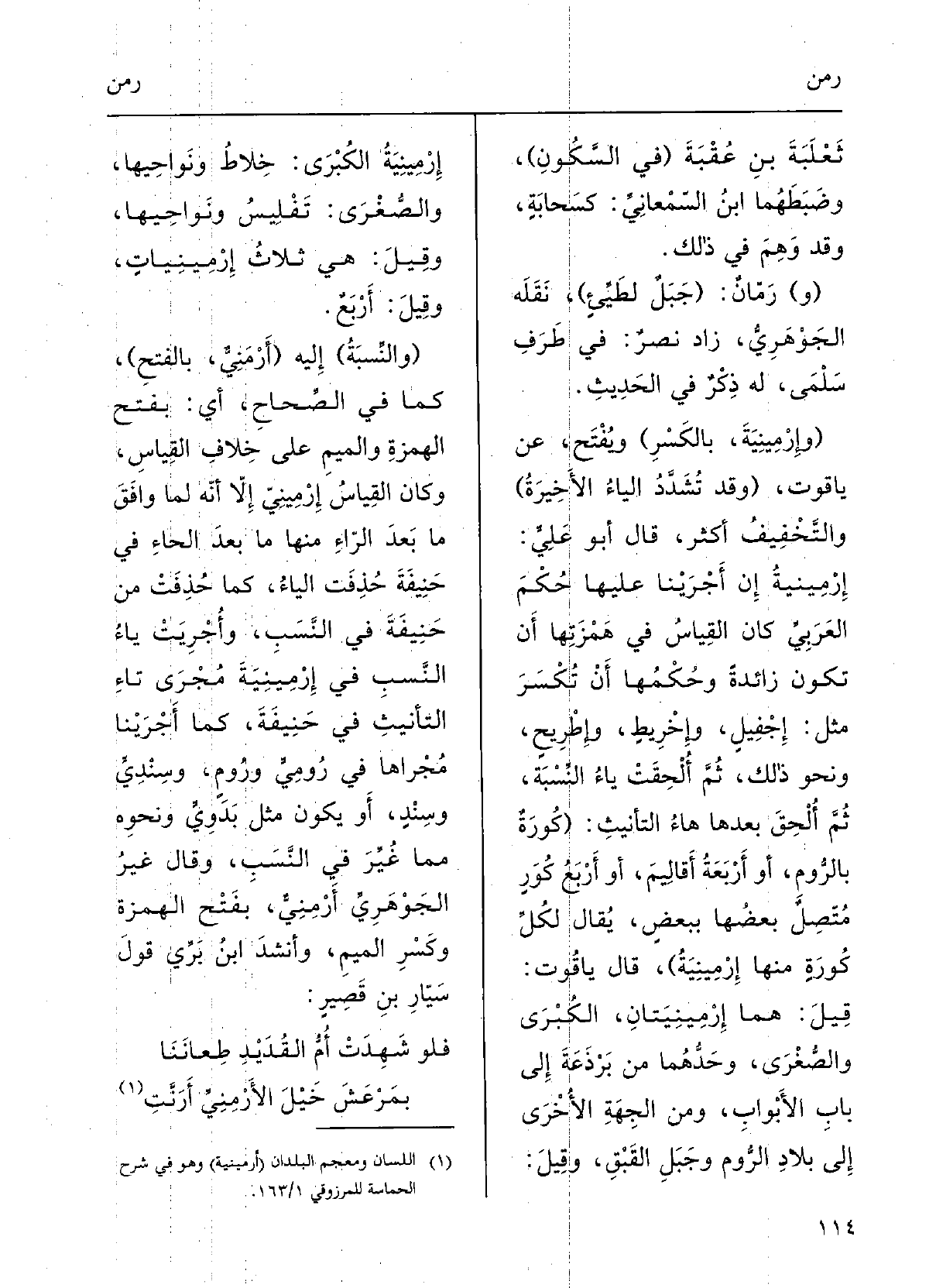 قالَ ياقوتُ: قيلَ هما أَرْمِينِيتان الكُبْرى والصُّغْرى، وحَدّهما مِن بَرْذَعَةَ إِلَى بابِ الأَبوابِ، ومِن الجهَةِ الأُخْرى إِلَى بلادِ الرُّومِ وجَبَلِ القَبْقِ؛ وقيلَ. إرْمِينِيَةُ الكُبْرى خِلاطُ ونَواحِيها، والصُّغْرى نغليس ونَواحِيها؛ وقيلَ: هِيَ ثلاثُ إرْمِينِيات؛ وقيلَ أَرْبعُ، (والنِّسْبَةُ) إِلَيْهِ (أَرْمَنِيٌّ بالفتْحِ) ، كَمَا فِي الصِّحاحِ، أَي بفتْحِ الهَمْزَةِ والميمِ على خِلافِ القِياسِ، وَكَانَ القِياسُ إِرْمِينيّ إلاَّ أنَّه لمَّا وافَقَ مَا بَعْد الرَّاء مِنْهَا مَا بَعْد الْحَاء فِي حَنِيفَة حُذِفَتِ الياءُ كَمَا حُذِفَتْ مِن حَنِيفَة فِي النَّسَبِ وأُجْرِيَتْ ياءُ النَّسَبِ فِي إِرْمِينِيَة مجْرَى تاءِ التأْنيثِ فِي حَنِيفَةَ، كَمَا أَجْرَيْنا مجْرَاها فِي رُوميّ ورُوم وسِنْدِيّ وسِنْد، أَو يكونُ مِثْلَ بَدَوَيّ ونحْوِه ممَّا غُيِّر فِي النَّسَبِ.