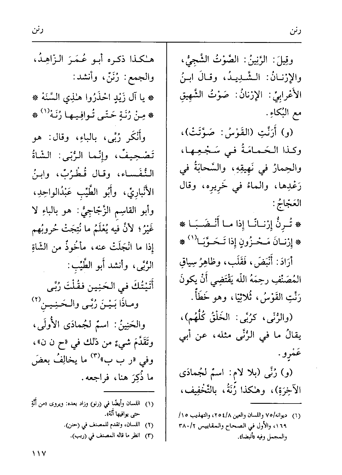 يَا آلَ زَيْدٍ احْذَرُوا هذي السَّنَهْمن رُنَةٍ حَتَّى تُوافِيها رُنَهْوأَنْكَر رُبَّى، بالباءِ، وقالَ: هُوَ تَصْحيفٌ، وإنَّما الرُّبَّى الشاةُ النَّفْساءُ.