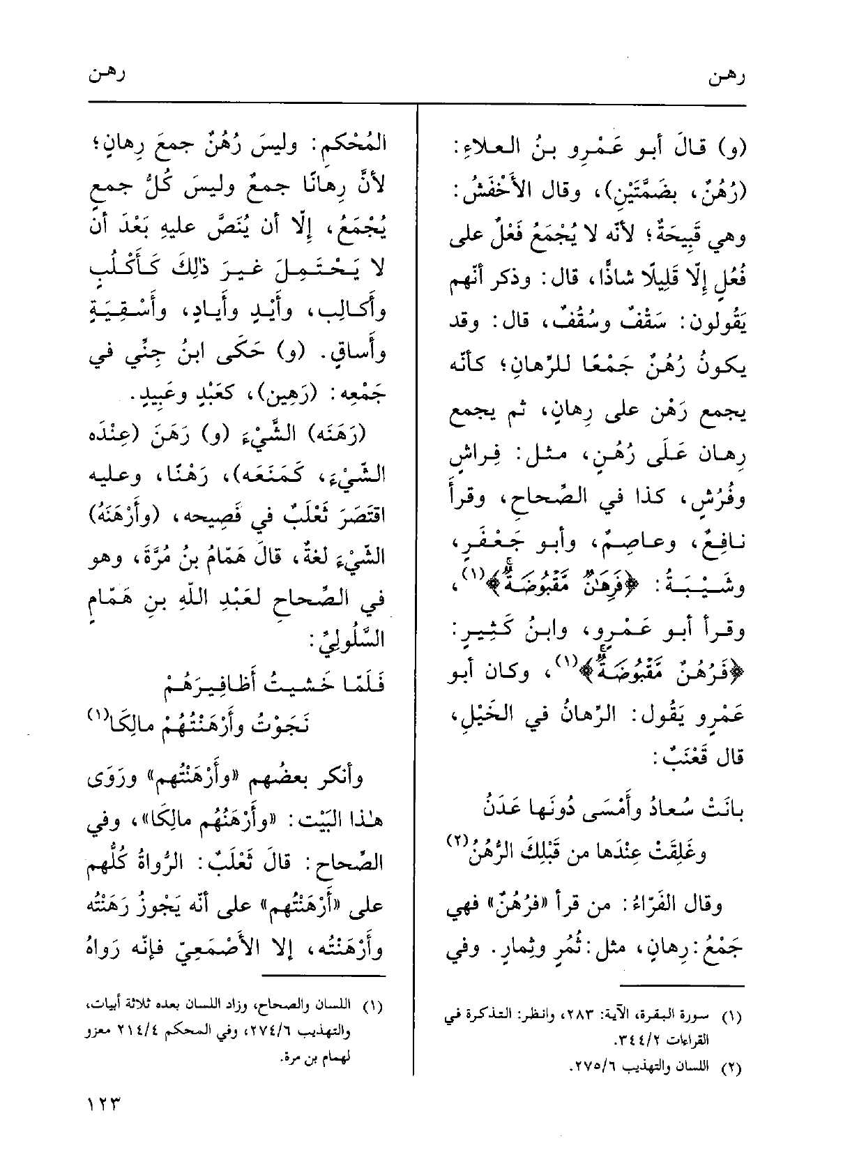 وقَرأَ نافِعٌ وعاصِمٌ وأَبو جعْفرٍ وشيبةُ: {فرِهانٌ مَقْبوضَةٌ} : وقَرَأَ أَبو عَمْرٍ ووابنُ كثيرٍ: {فرُهُنٌ مَقْبوضَةٌ} ؛ وكانَ أَبو عَمْرٍ ويقولُ: الرِّهانُ فِي الخيْلِ؛ قالَ قَعْنَب: