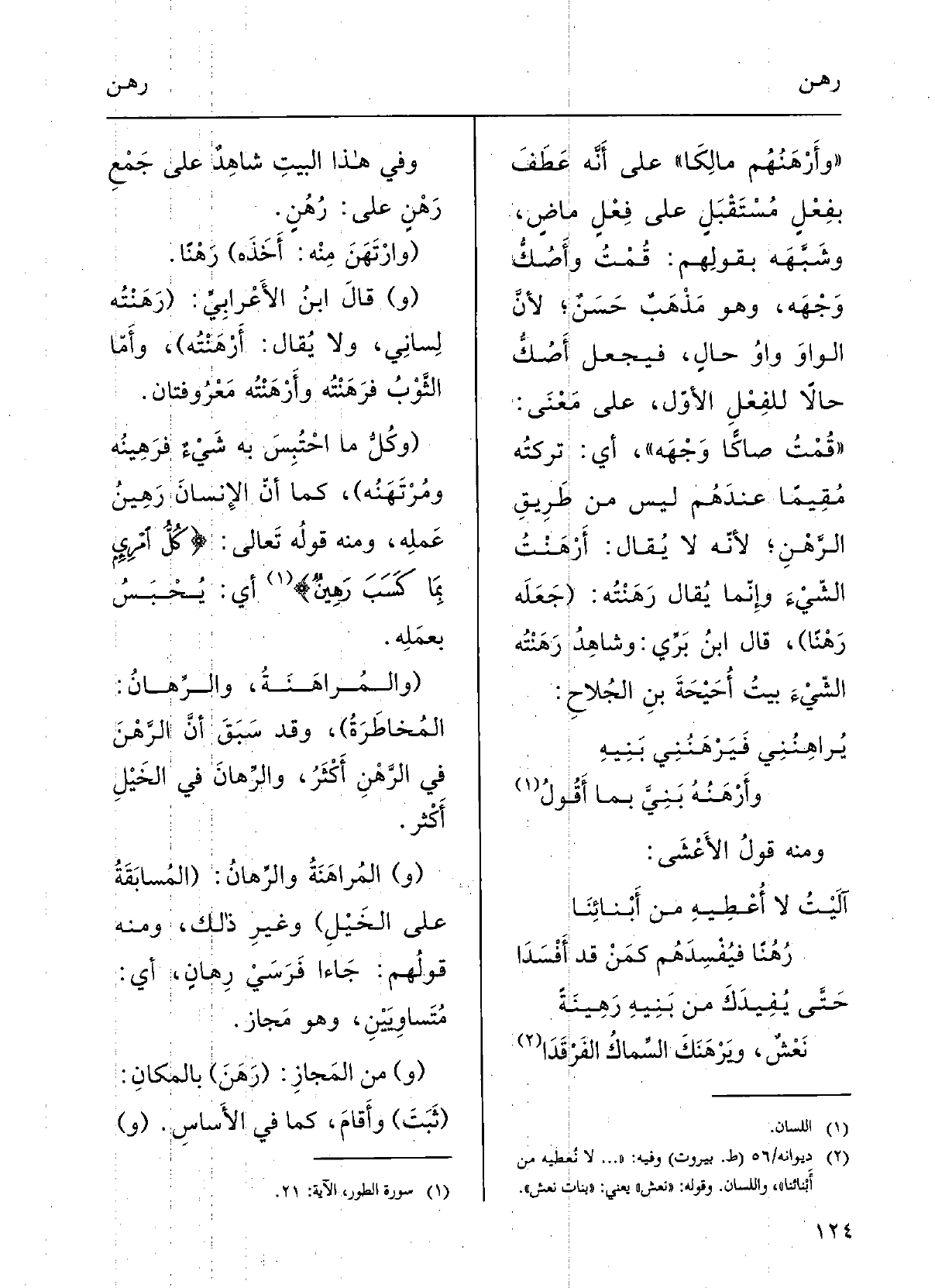 آلَيْتُ لَا أُعْطِيه من أَبْنائِنارُهُناً فيُفْسِدُهم كمنْ قد أَفْسَداحتى يُفِيدَك من بنيهِ رَهِينةًنَعْشٌ ويَرْهَنك السِّماكُ الفَرْقداوفي هَذَا البيتِ شاهِدٌ على جَمْعِ رَهْنٍ على رُهُنٍ.