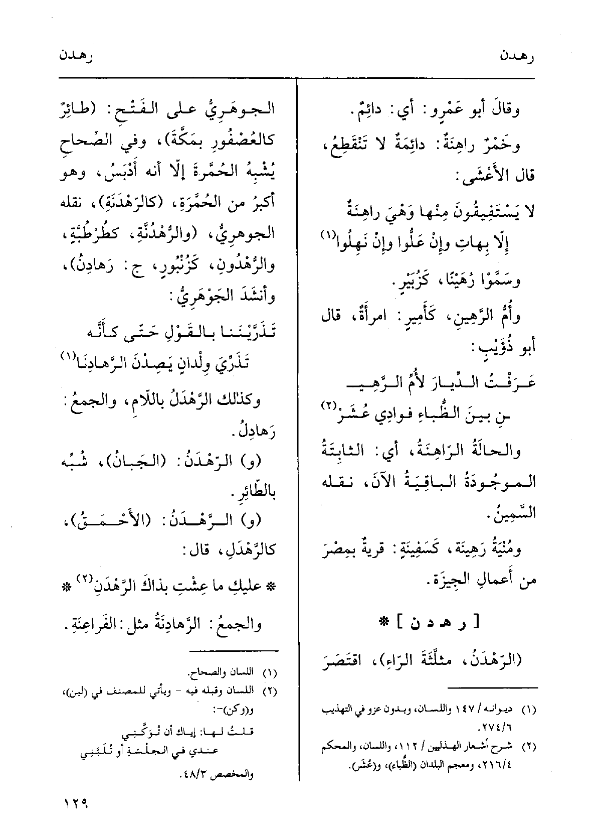 : (الِرَّهْدَنُ، مُثَلَّثَةَ الَّراءِ) ، اقْتَصَرَ الجَوْهرِيُّ على الفتْحِ: (طائِرٌ كالعُصْفُورِ بمكَّةَ) وَفِي الصِّحاحِ: يشْبِهُ الحُمَّرةَ إلاَّ أنَّه أَدْبَسُ، وَهُوَ أَكْبر من الحُمَّرةِ، (كالرَّهْدَنَةِ) ؛ نَقَلَه الجَوْهرِيُّ؛ (والرُّهْدُنَّةِ، كَطُرْطُبَّةٍ، والرُّهْدُونِ، كزُنْبُورٍ، ج رَهادِنُ) ؛ وأَنْشَدَ الجَوْهرِيُّ: