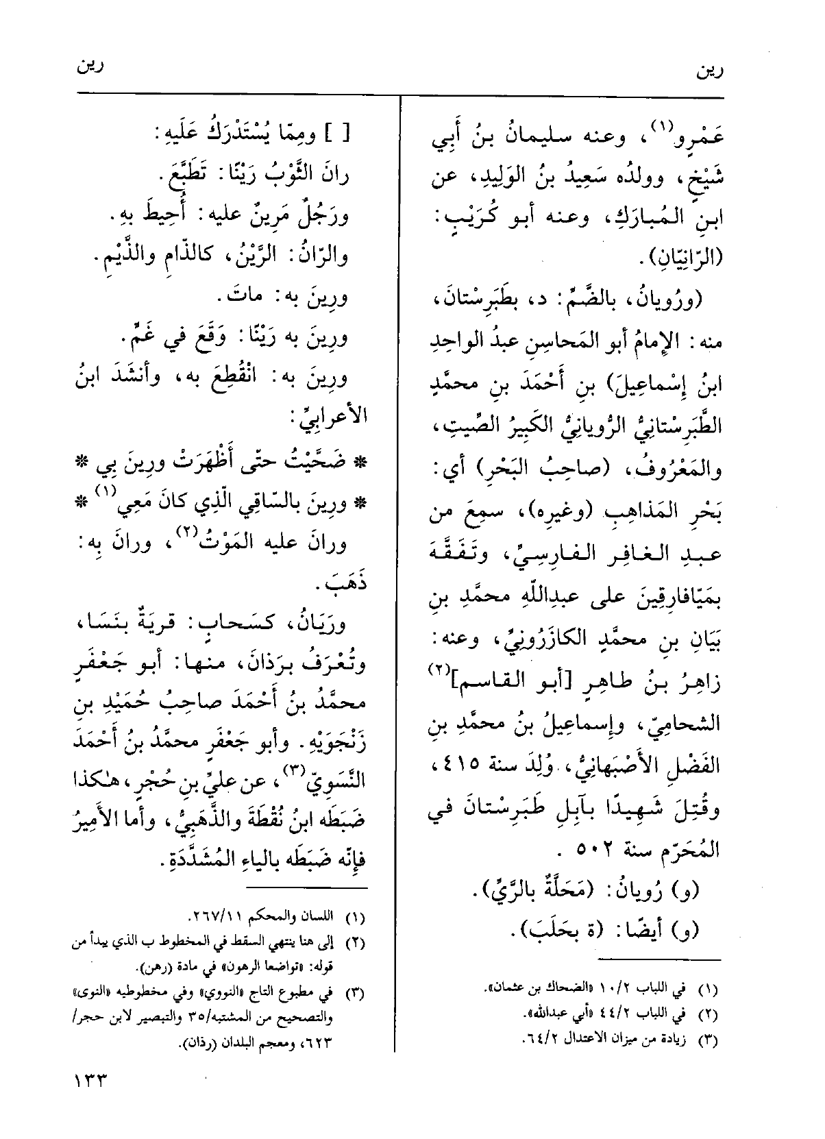 ! وريانُ، كسحابٍ: قَرْيةٌ بنَسَا، وتُعْرَفُ برذان، مِنْهَا: أَبو جَعْفرٍ محمدُ بنُ أَحْمدَ صاحِبُ حميد بنِ زِنْجَوَيْة، وأَبو جَعْفرٍ محمدُ بنُ أَحْمدَ النوويُّ عَن عليِّ بنِ حَجَر، هَكَذَا ضَبَطَه ابنُ نُقْطَةَ والذَّهبيُّ، وأَمَّا الأَميرُ فإنَّه ضَبَطَه بالياءِ المشدَّدَةِ