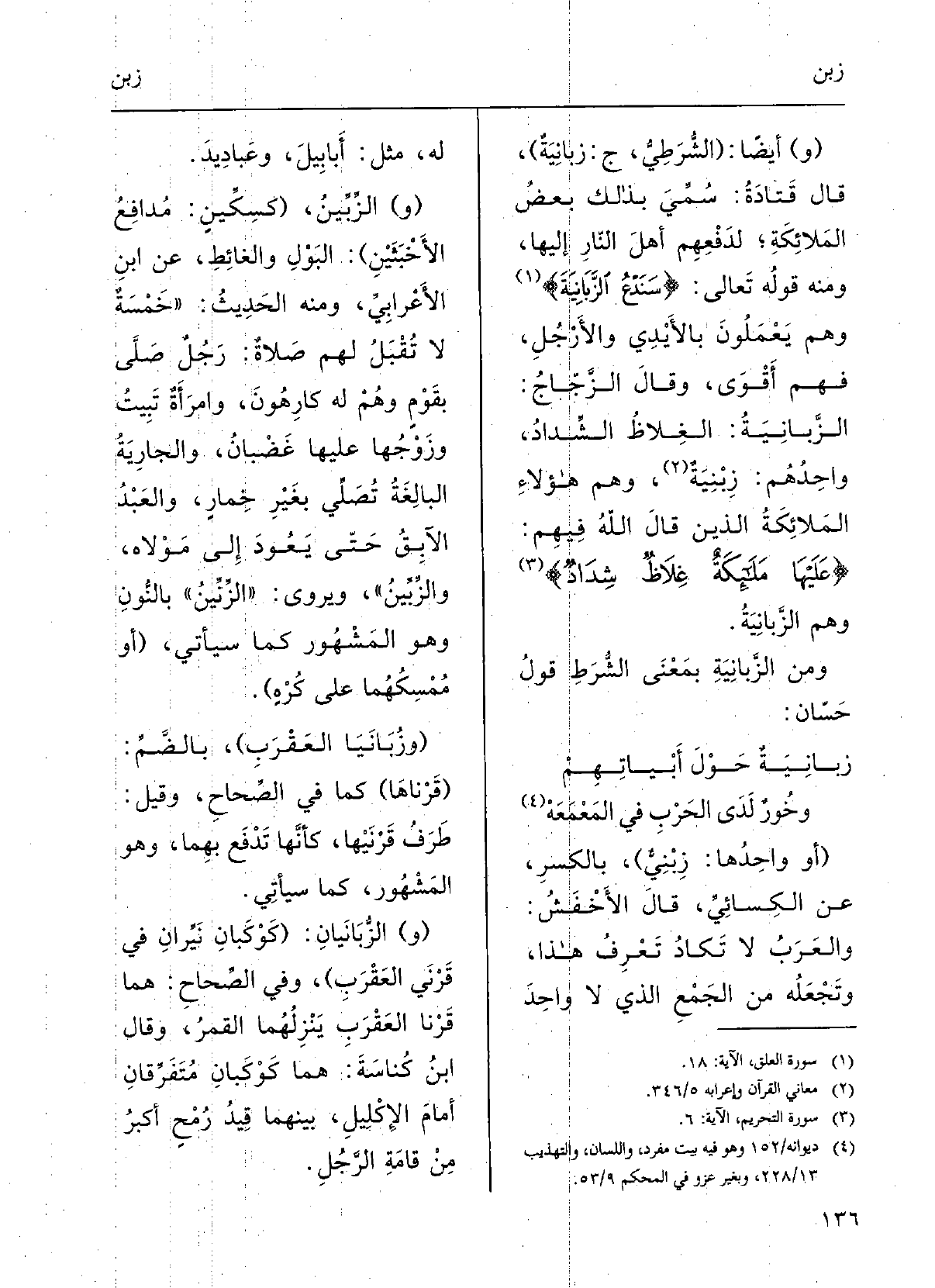 زَبانِيَةٌ حولَ أَبياتِهموخُورٌ لَدَى الحرْبِ فِي المَعْمَعَه (أَو واحدُها زِبْنِيٌّ) ، بالكسْرِ عَن الكِسائيِّ.