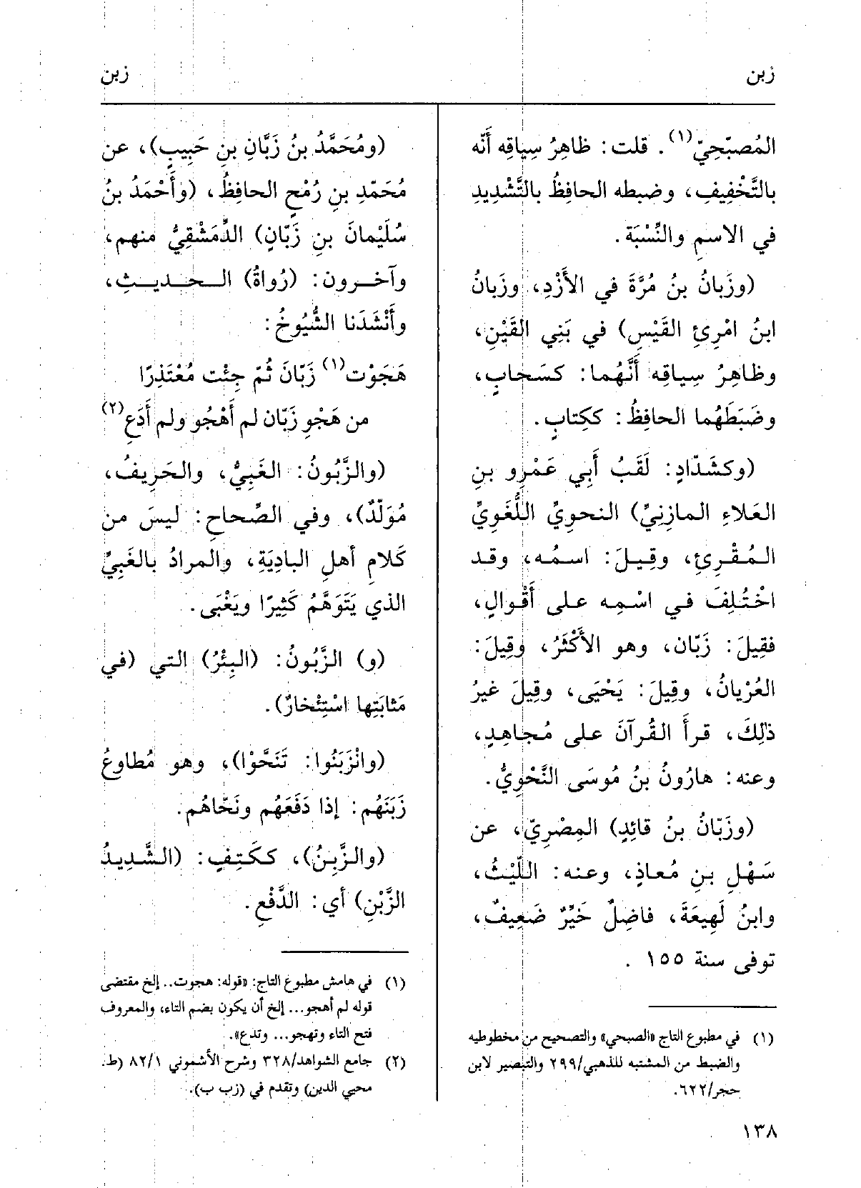 (وزَبانُ بنُ مُرَّةَ فِي الأَزْدِ، وزَبانُ بنُ امِرىءِ القَيْسِ) فِي بني القَيْنِ؛ وظاهِرُ سِياقِه أَنَّهما كسَحابٍ، وضَبَطَهما الحافِظُ ككِتابٍ.
