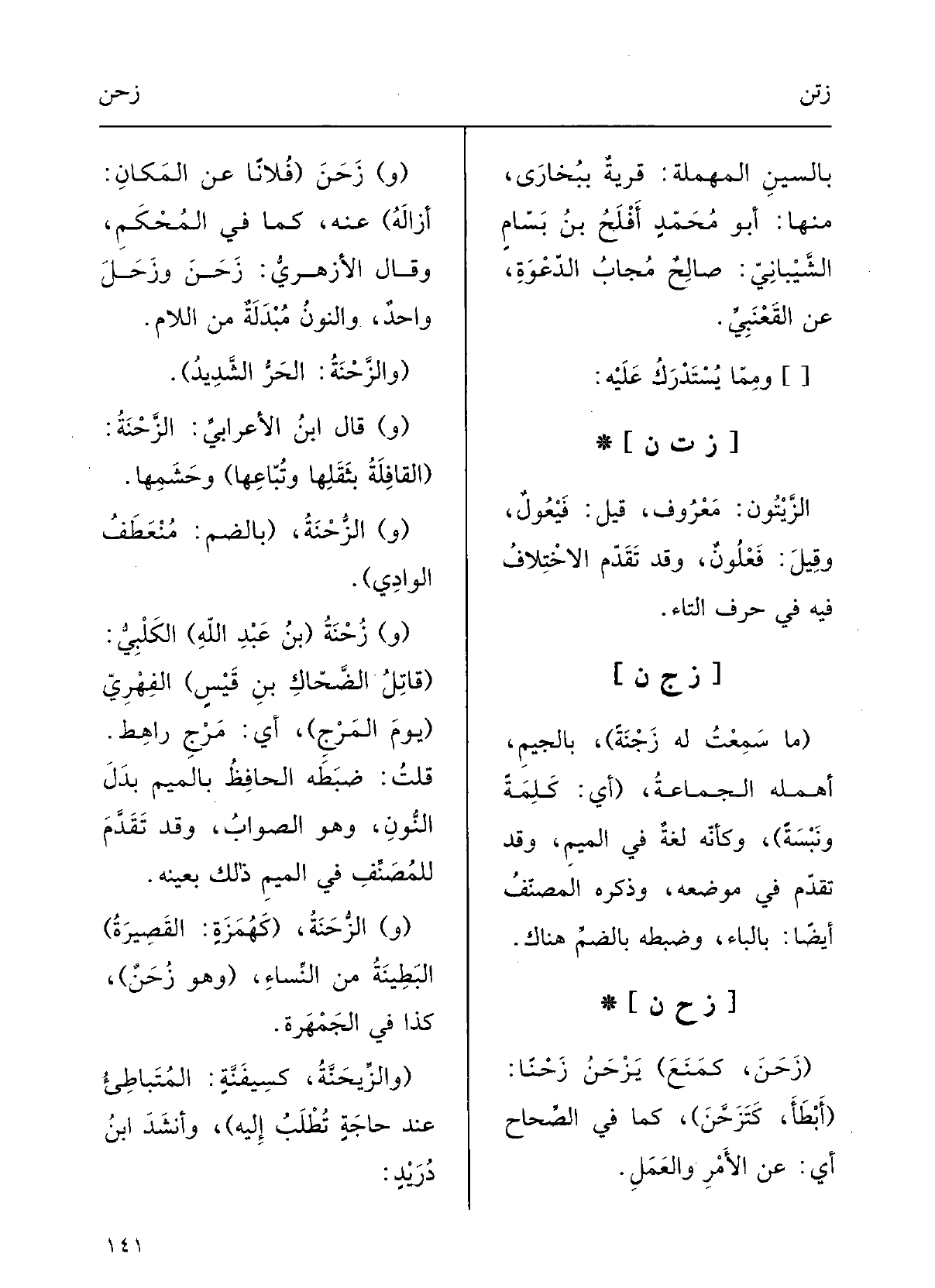 وقالَ الأزْهرِيُّ: زَحَنَ وزَحَلَ واحِدٌ، والنُّونُ مُبْدَلَةٌ مِن اللامِ.