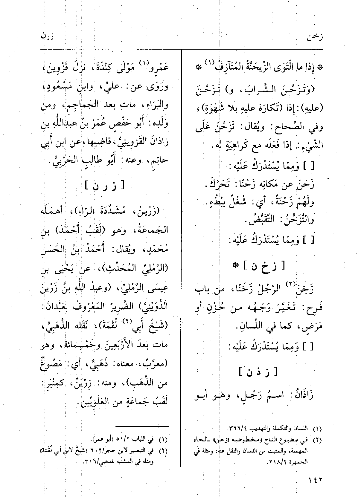 : زَاذَان: اسمُ رجُلٍ وَهُوَ أَبو عَمْرٍ وموْلَى كنْدَةَ، نَزَلَ قزْوينَ ورَوَى عَن عليِّ وابنِ مَسْعود والبرَّاء، ماتَ بعْدَ الجمَاجِم، ومِن ولدِهِ أَبو حفْصَ عْمَرُ بنُ عبدِ الّلهِ بنِ زَاذَان القزْوِينيُّ قاضِيها، عَن ابْن أَبي حاتمٍ، وَعنهُ أَبو طَالب الحربيُّ.