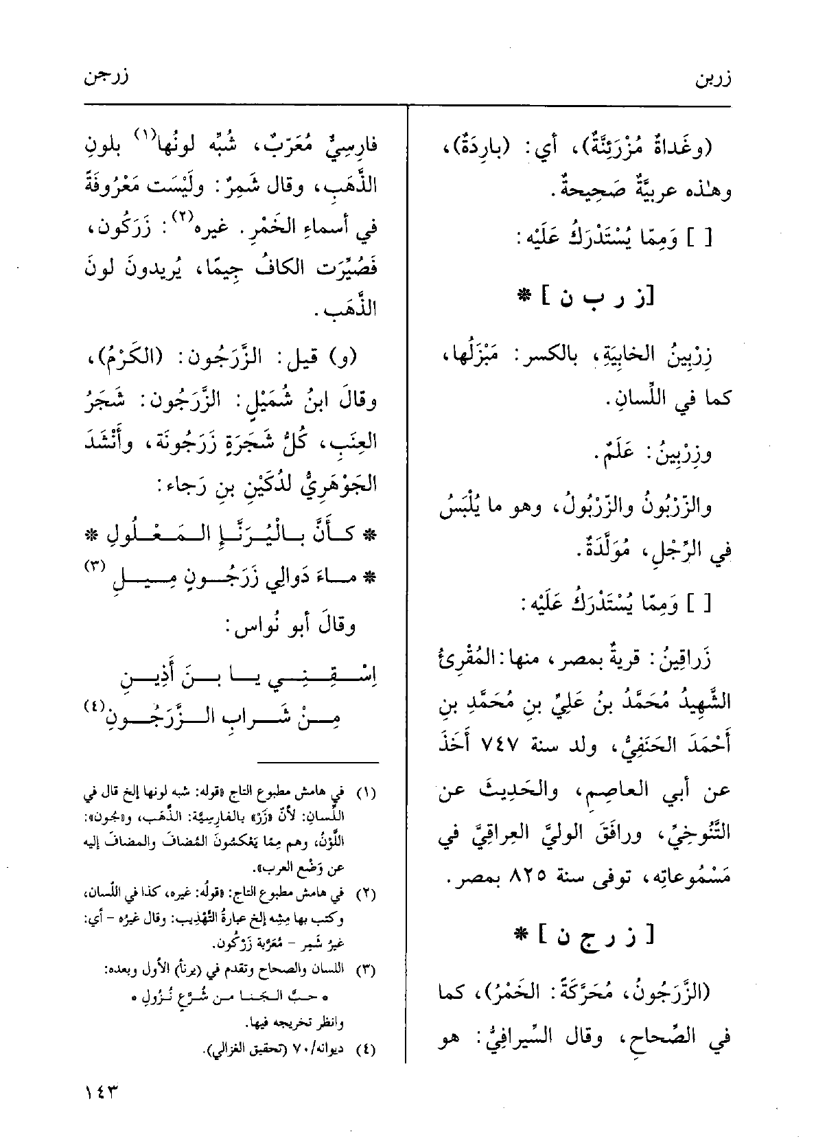 غَيْره: زَرَكُون، فصُيِّرَتِ الكافُ جِيماً، يُريدُونَ لوْنَ الذَّهَبِ (و) قيلَ: الزَّرَجُونُ: (الكَرْمُ) .
