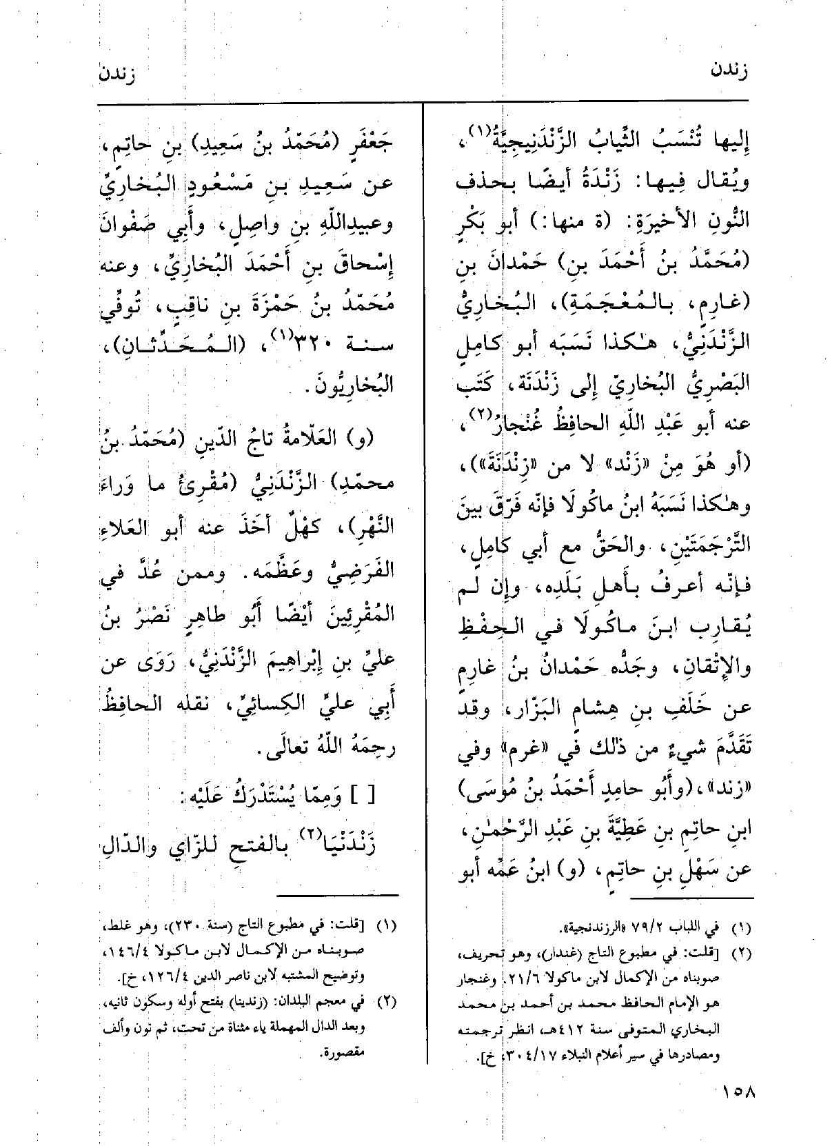 إِلَيْهَا تُنْسَبُ الثيابُ الزَّنْدَنِيجِيَّةُ، ويقالُ فِيهَا زَنْدَةُ أَيْضاً، بحذْفِ النُّونِ الأخيرَةِ (ة، مِنْهَا) : أَبو بكْرٍ (محمدُ بنُ أَحمدَ بنِ) حمدَان بنِ (غارِمٍ، بالمُعْجمةِ) ، البُخارِيُّ الزَّنْدَنيُّ، هَكَذَا نَسَبَه أَبو كامِلٍ البَصْريُّ البُخارِيُّ إِلَى زَنْدَنَة، كتب عندَ أَبي عبدِ اللهاِ الحافِظُ غندار، (أَو هُوَ من زَنْدَلا من زَنْدَنَةَ) ، وَهَكَذَا نَسَبَه ابنُ مَاكُولَا، فإنَّه فَرَّقَ بَين التَّرْجَمَتَيْن، والحقُّ مَعَ أبيِ كامِلٍ، فإنَّه أَعْرَف بأَهْلِ بِلَدِهِ، وَإِن لم يُقارِبْ ابْن مَاكُولَا فِي الحفْظِ والاتْقانِ، وجَدّه حمدَان بنِ غارِمٍ عَن خَلَف ابنِ هِشَامٍ البزَّارِ، وَقد تقدَّمَ شيءٌ مِن ذلِكَ فِي غَرَمَ وَفِي زَنَدَ (وَأَبُو حامِدٍ أَحمدُ بنُ موسَى) بنِ حاتِمٍ بنِ عطيةَ بنِ عبْدِ الرَّحْمن عَن سهْلِ بنِ حاتِمٍ؛ (و) ابنُ عمِّه أَبو جَعْفرٍ (محمدُ بنُ سعيدِ) بنِ حاتِمٍ عَن سعيدِ بنِ مَسْعودٍ البُخارِيِّ وعُبَيْدِ اللهاِ بنِ واصِلٍ وأَبي صَفْوان إسْحق بنِ أَحمدَ البُخارِيّ، وَعنهُ محمدُ بنُ حَمْزَةَ بنِ ناقبٍ، تُوفي سَنَة 230، (المحدِّثانِ) ، البُخارِيُّون.