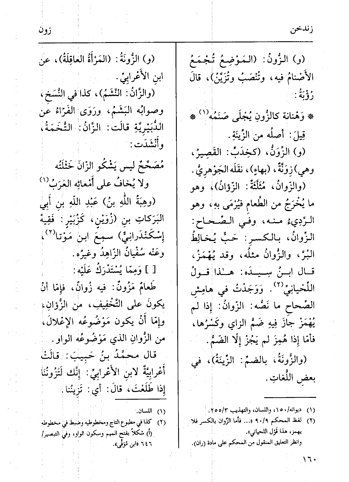 قالَ محمدُ بنُ حبيبٍ: قالَتْ أَعْرابيَّةٌ لابنِ الأَعْرابيِّ: إنَّك} لتَزوننا إِذا طَلَعَتْ، قالَ: أَي تُزِينُنا.
