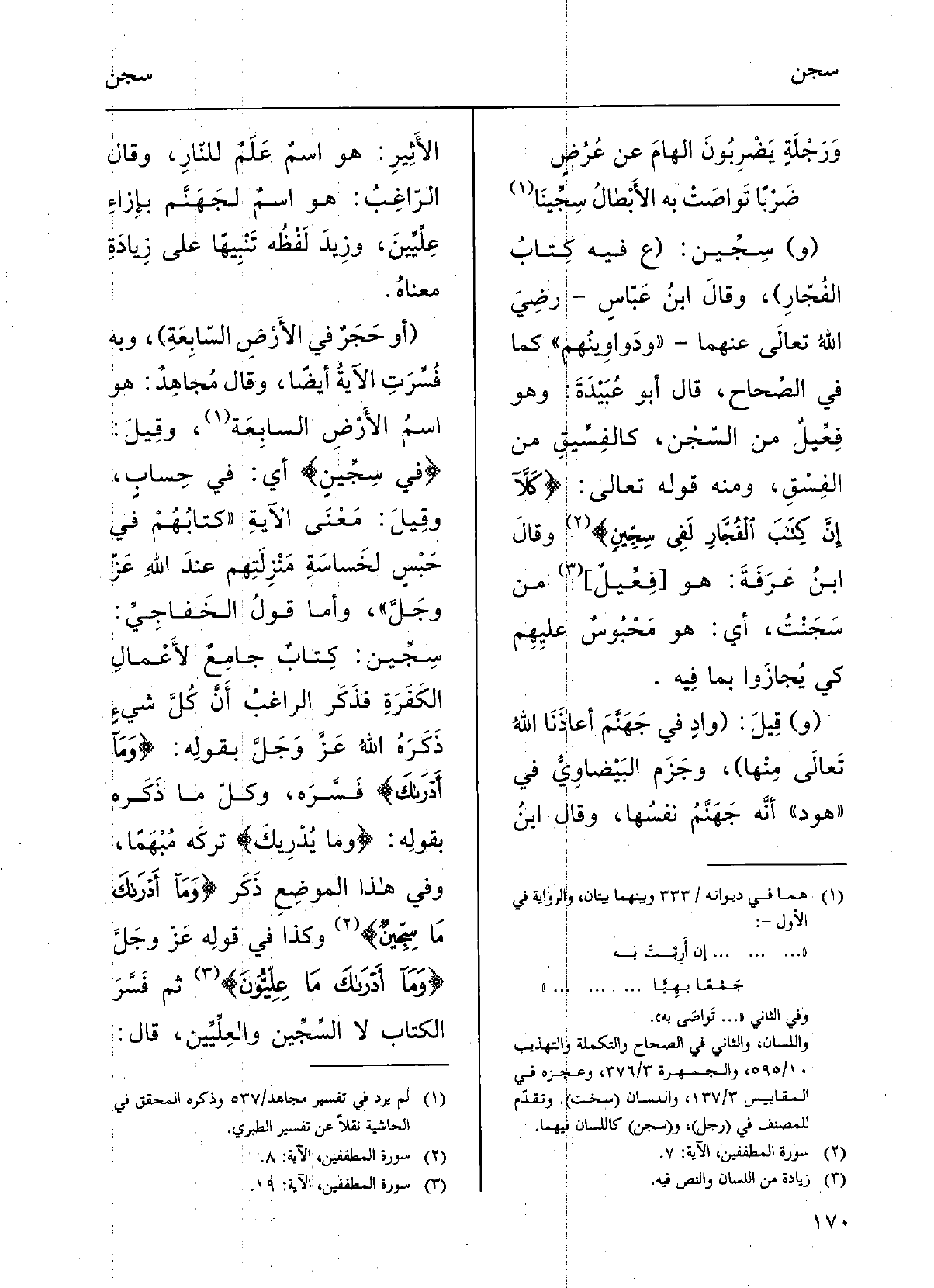 ورَجْلةً يَضْرِبونَ الهامَ عَن عُرُضٍ ضَرْباً تواصَتْ بِهِ الأَبطالُ سِجِّينا (و) سِجِّينٌ: (ع فِيهِ كِتابُ الفُجَّارِ) ؛ وقالَ ابنُ عبَّاسٍ، رضِيَ الّلهُ تعالَى عَنْهُمَا: ودَواوِينُهم؛ كَمَا فِي الصِّحاحِ.