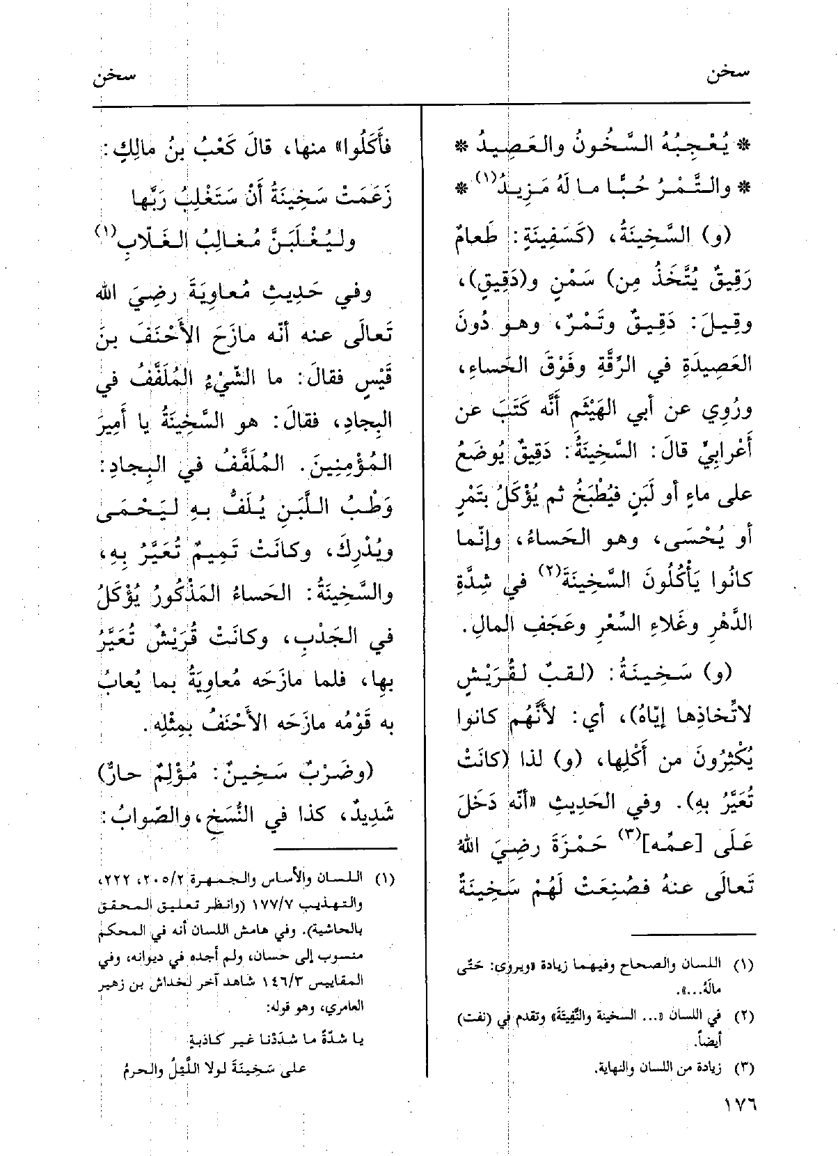 وَفِي الحدِيثِ: أنَّه دَخَلَ على حَمْزَة، رَضِيَ الّلهُ تَعَالَى عَنهُ، فصُنِعَتْ لَهُم سَخِينَةٌ فأَكَلُوا مِنْهَا؛ قالَ كعْبُ بنُ مالِكٍ: