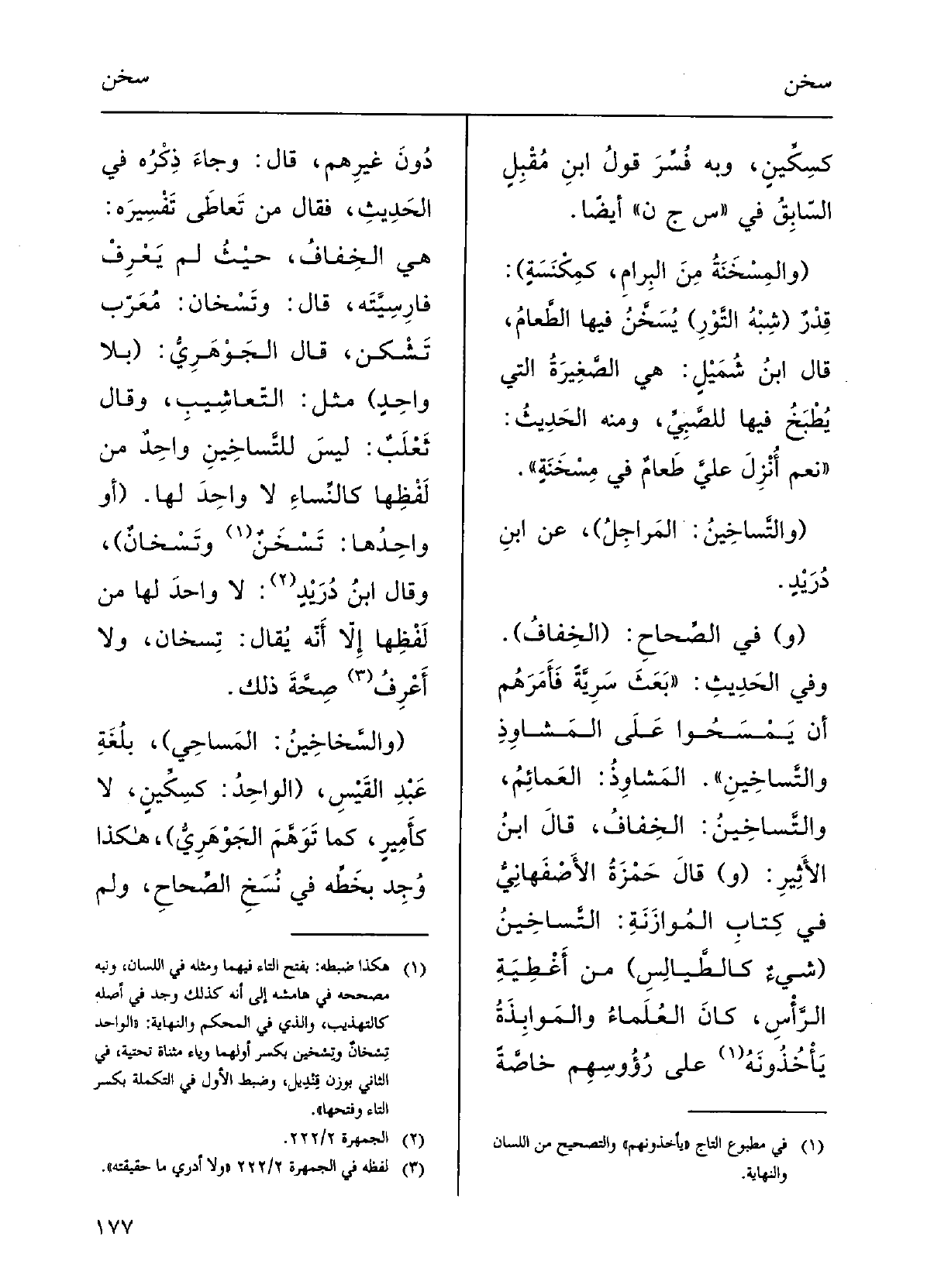 قالَ ابنُ الأَثيرِ: (و) قالَ حَمْزَةُ الأَصْفهانيُّ فِي كتابِ المُوازَنَةِ: التسَّاخِينُ (شيءٌ كالطَّيالِسِ) مِن أَغْطِيَةِ الرأْسِ كانَ العُلَماءُ والمَوَابِذةُ يأْخذُونهم على رُؤُوسهم خاصَّةً دُونَ غيْرِهم؛ قالَ: وجاءَ ذِكْرُه فِي الحدِيثِ، فقالَ مَنْ تَعاطَى تَفْسِيرَه هِيَ الخِفافُ حيثُ لم يَعْرِفْ فارِسِيَّتَه، قالَ: وتَسْخان مُعَرَّبُ تَشْكَن.